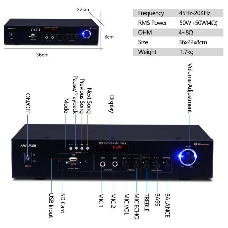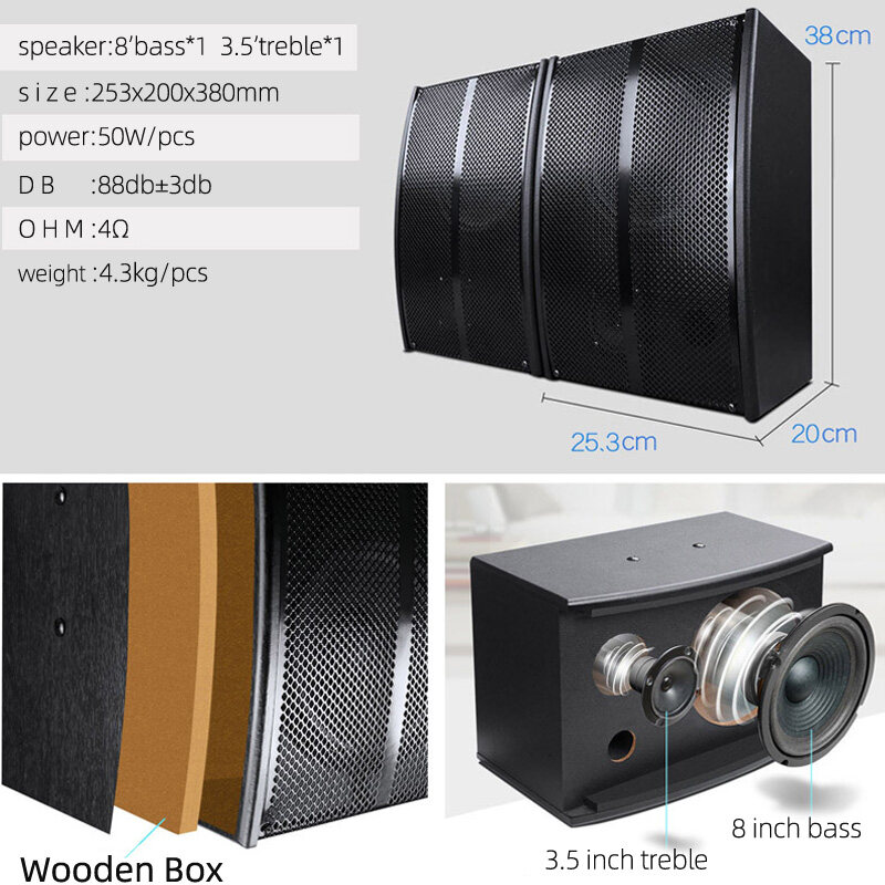 Speaker is wooden material. 2-Channel power amplifier (Upgraded version 50W+50W).Amplifier built-in Bluetooth for easy entertainment. Free 2 wireless microphones. Amplifier can only be used with 220V~240V 50Hz/60Hz AC power supply.Suitable for 40㎡-80㎡ of space use.Each speaker uses a 8 inch woofer and 3.5 inch tweeter.Supports microphone input, Bluetooth, and USB input.Can be connected to Bluetooth, mobile phones, TV, TV BOX, PC, etc. to play sounds.In the package: Amplifier x1, Speaker x2, Wireless MIC x2, Remote Control x1, Speaker Line x2, Audio Cable x1