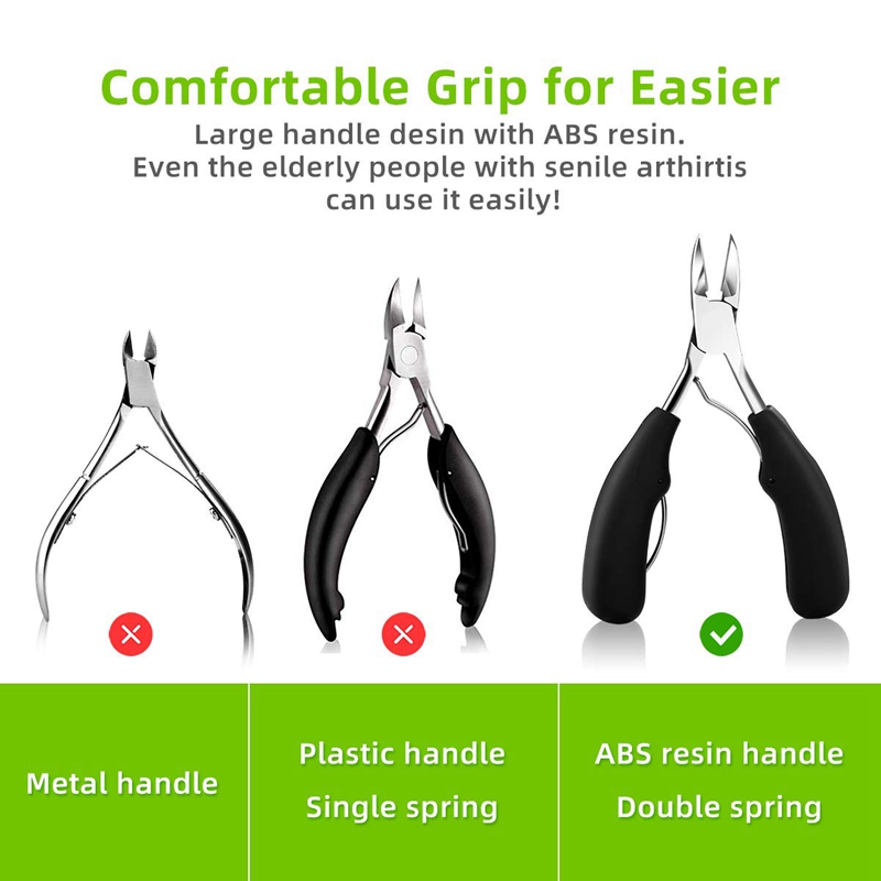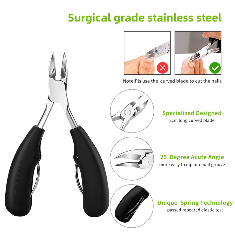 [UPGRADED CLIPPER] Nail clippers with non-slip ergonomic handle and large opening, takes less hand force to cut all size nails, including ingrown toenail, thick toenail, hard nail, grey nail, grooved nail etc. The sharp curved blade edge like eagle mouth fits the nail arc closely, is good at deeping into the nail groove to trim ingrown toenails.