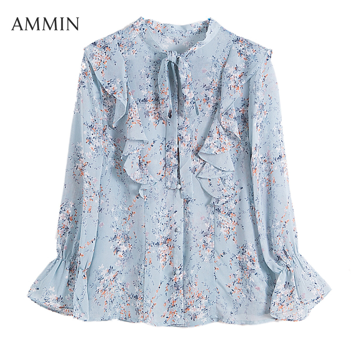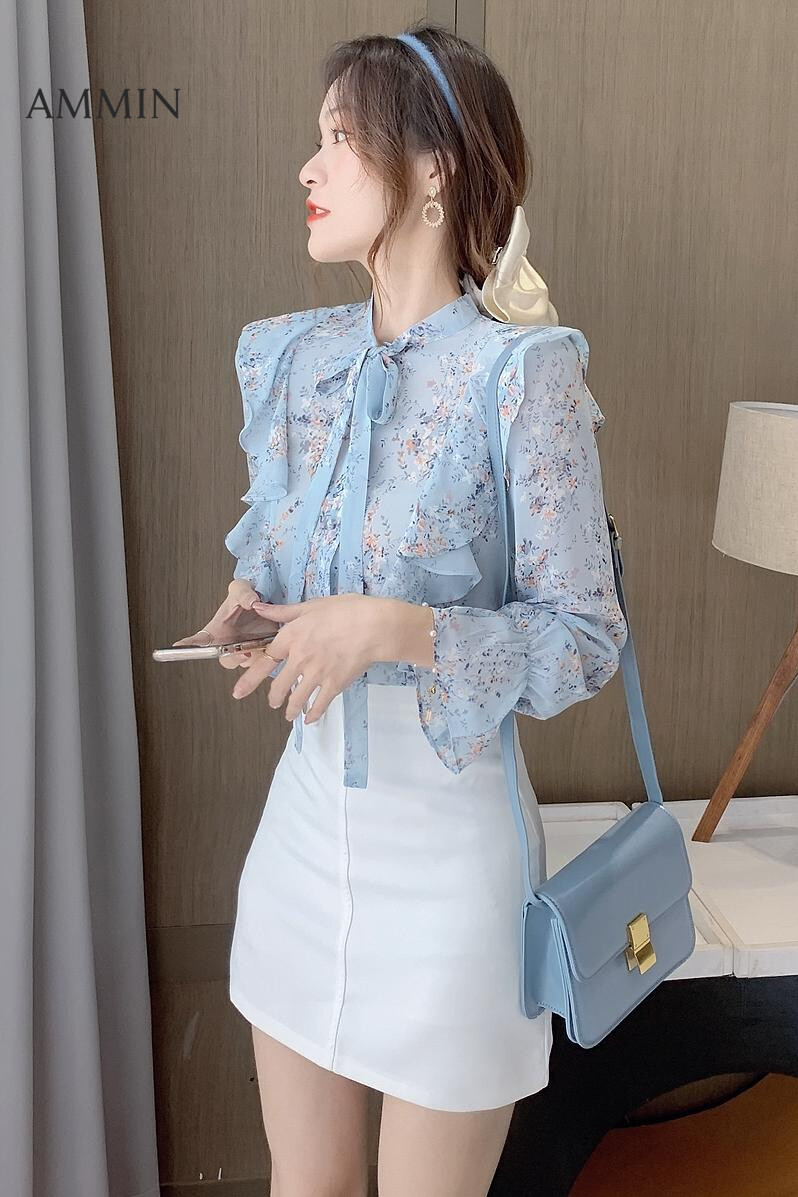 AMMIN Korean style bowknot chiffon shirt women's ruffled floral new top 2020 autumn all-match long-sleeved lace blouse
