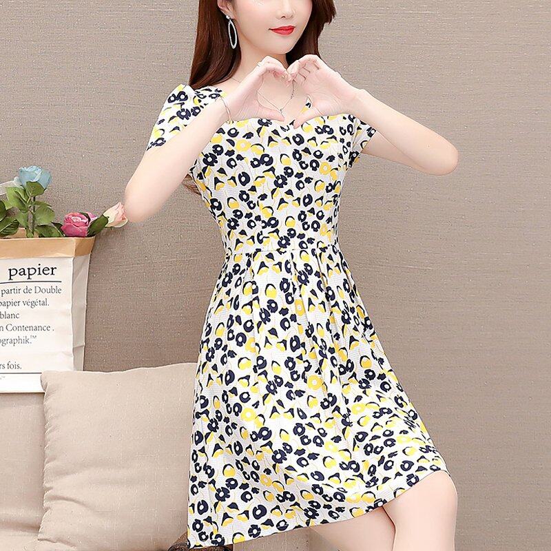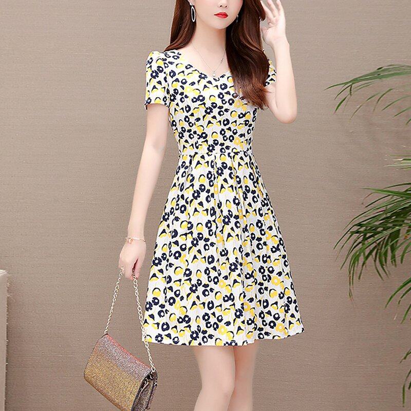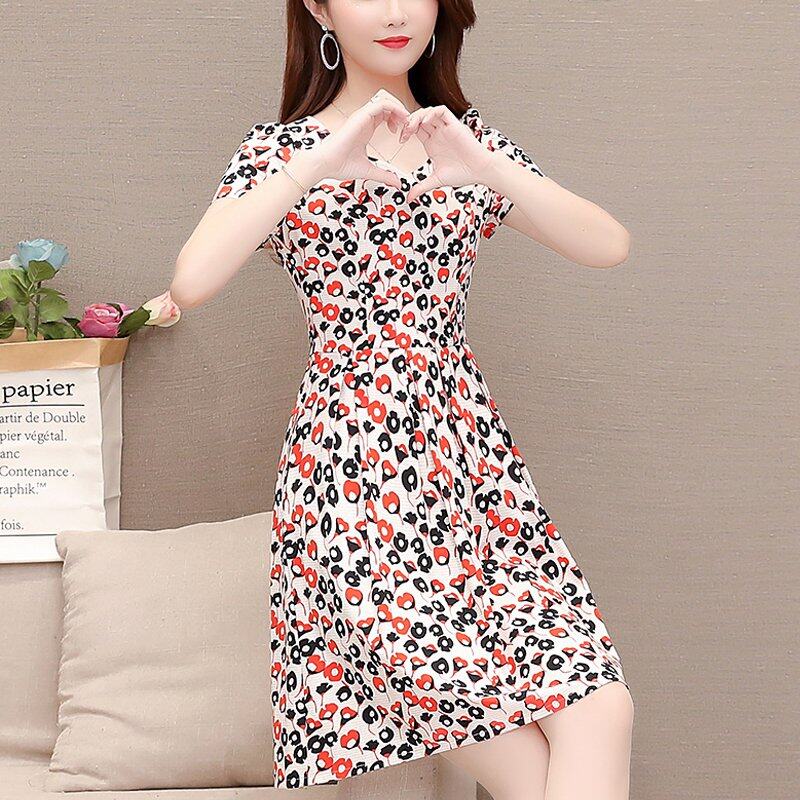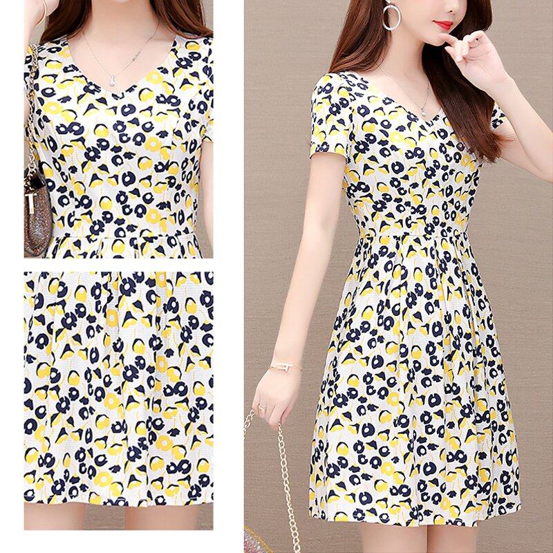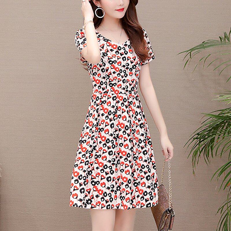 • INWPLLR Women Floral Dress Korean Peplum Slim Dresses Fashion Short Sleeve V-Neck A-Line Dress Lady Printed Dresses Plus Size