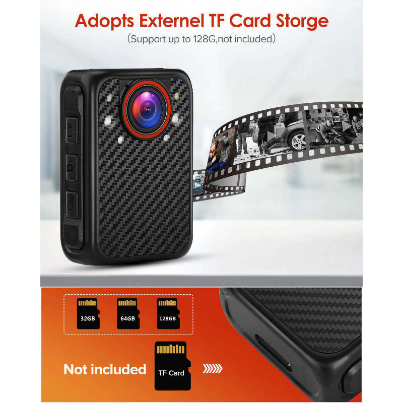 【External Memory Card Up To 128GB:】 X1 portable human body camera uses external micro SD card storage to provide you with flexible storage space; supports external mirco SD cards up to 128G (this product does not include memory cards.)