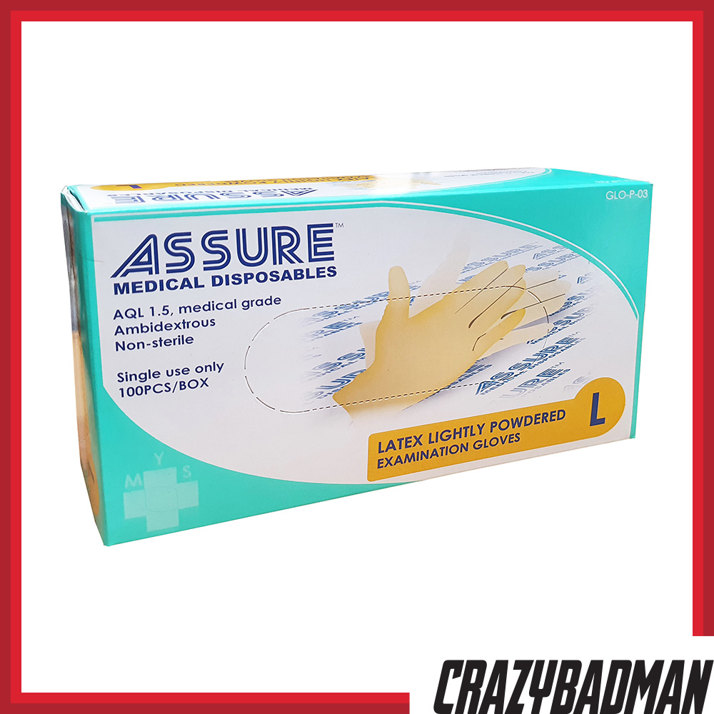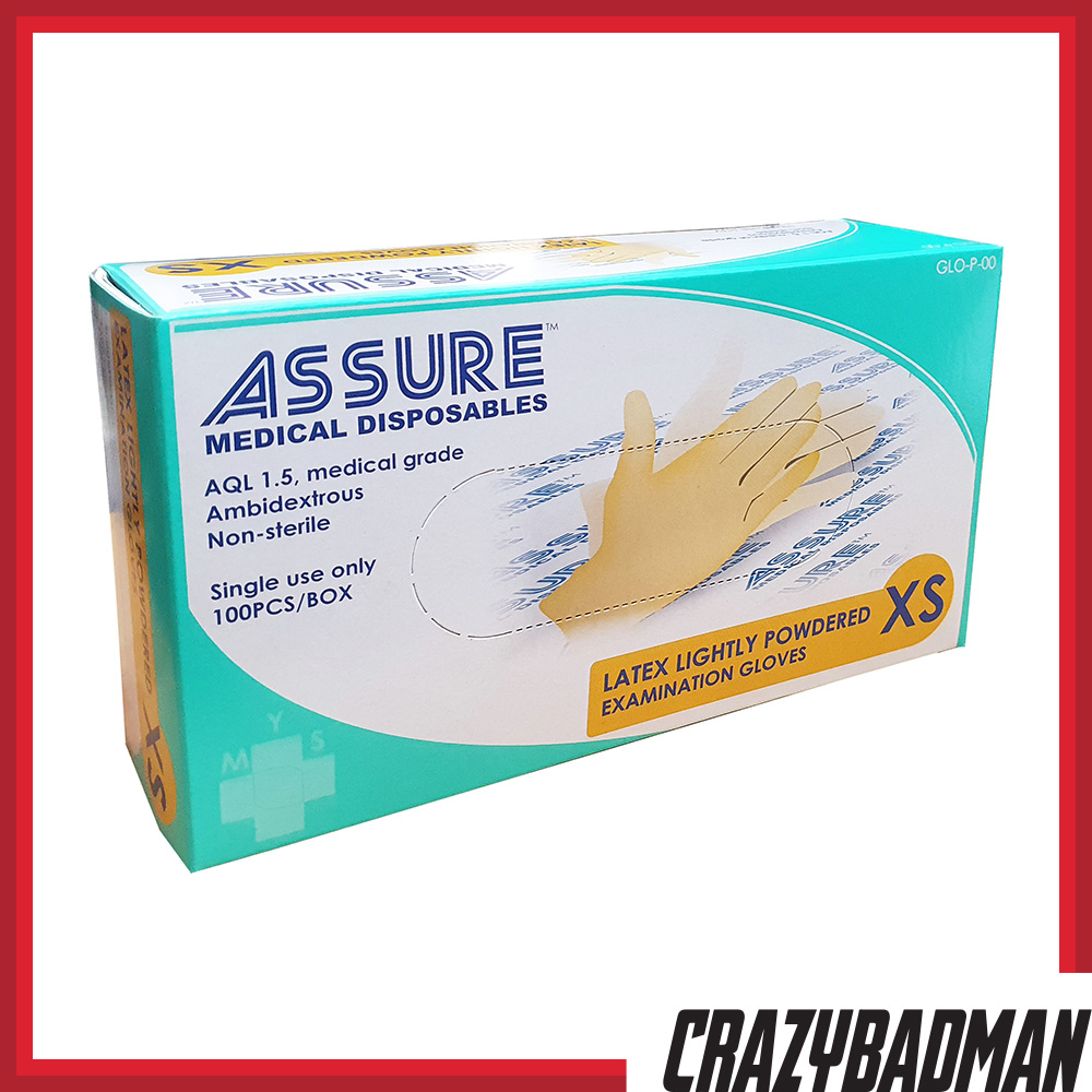 ASSURE Disposable Examination Latex Gloves Lightly Powdered (100pcs/box, Size: XS/S/M/L)