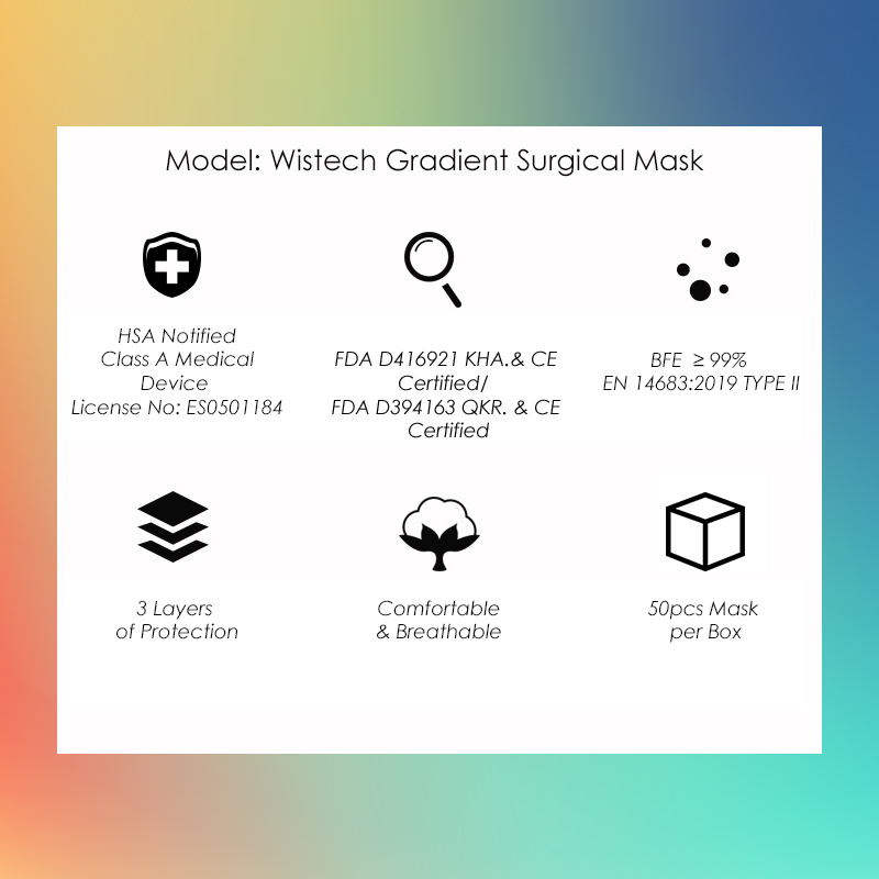 [GET %% OFF MIX AND MATCH] RAINBOW Gradient Wistech 3 Ply Surgical Face Mask , 50 pieces, HSA Notified Medical Device, FDA CE Approved, BFE 99%, Singapore Ready Stock