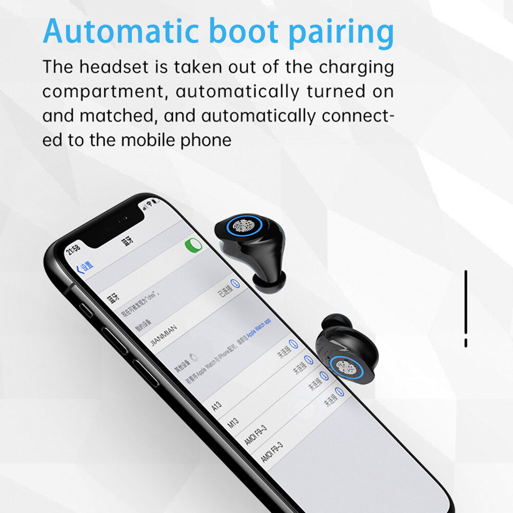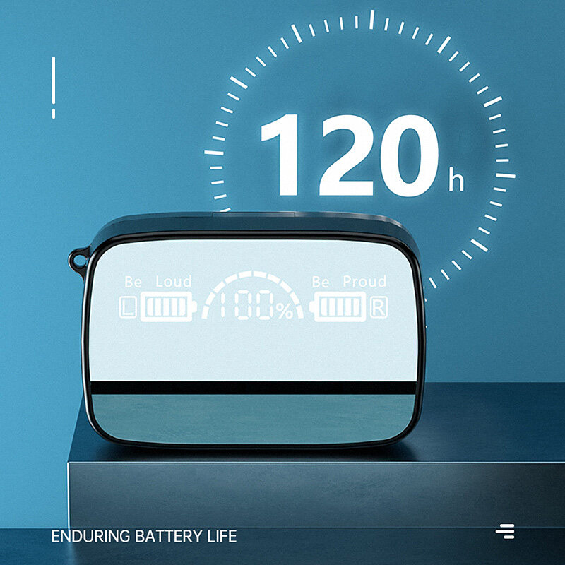 1. LED power display,Intuitive to know the electricity level oCharging cabin and the headset at a glance,2200mAh charging case can full charge 2 earphones around 12 times, offer more 50 Hours music time