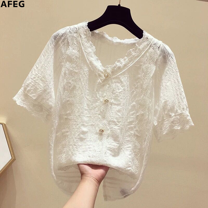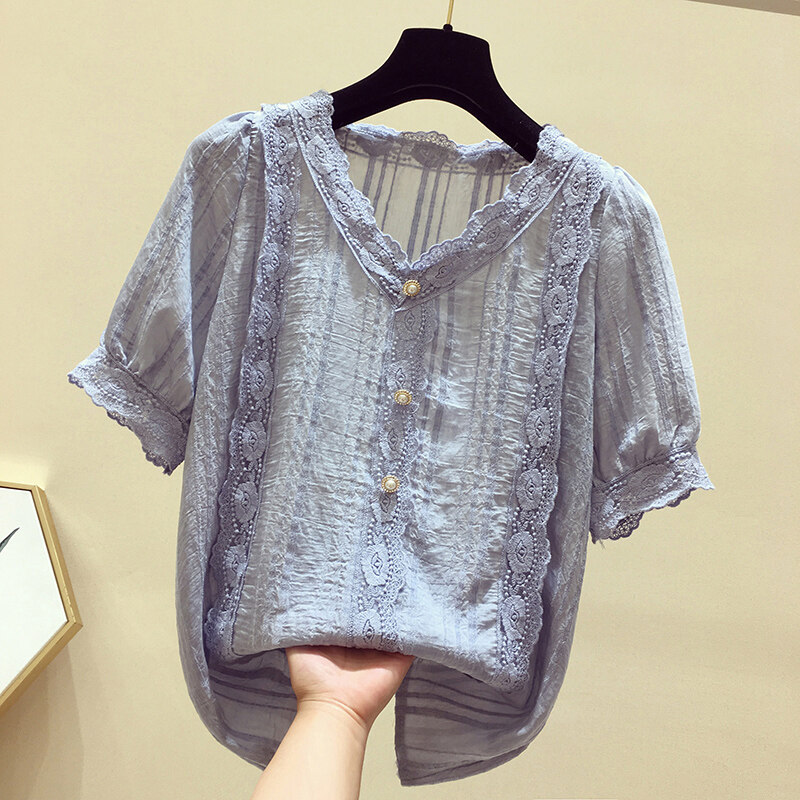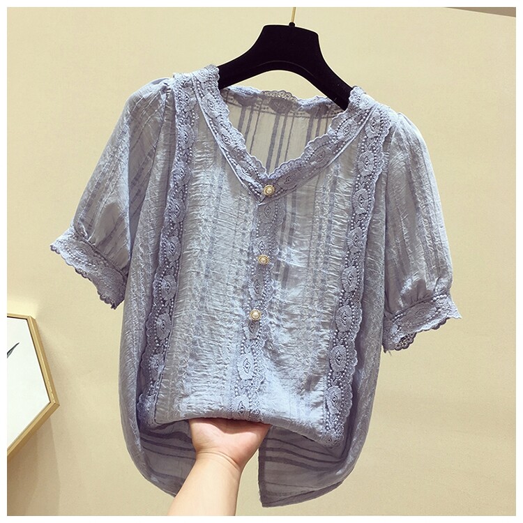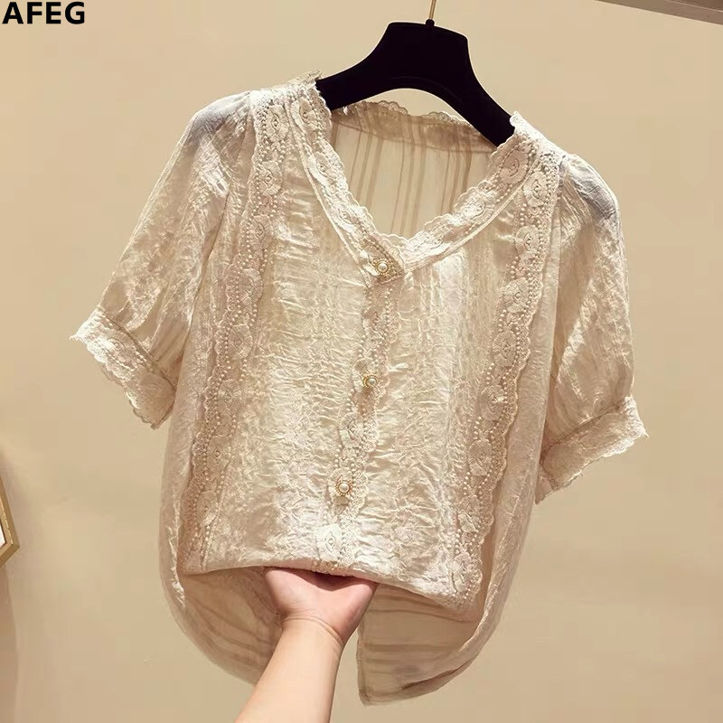 AFEG new Korean version of V-neck fashion loose wild lace stitching short-sleeved blouse for women