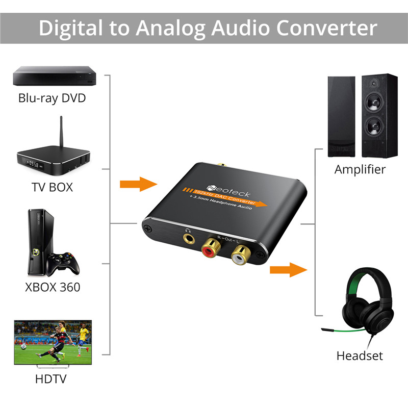 • Converts coaxial or toslink digital audio signals to analog L/R audio and connects to an external device such as an amplifier via standard RCA jacks