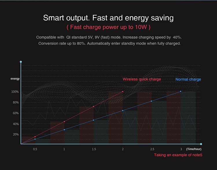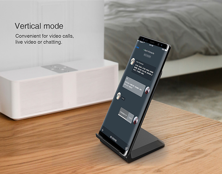 Fast Wireless Charging StandCable-Free convenience, simplify chargingCable-Free charging for ultimate enjoymentStand design with dual coils, wider transmission rangeSmart output and protectionSafety certificationEfficient and environmentally friendlyVertical Mode - Convenient for video calls, live video or chattingHorizontal Mode - Convenient for watching videos or gamingSmart Output. Fast and energy Saving - Fast charge power up to 10WCompartible with QI Standard 5V, 9V(Fast mode). Increase charging speed by 40%. Conversion rate up to 80%. Automatically enter standby mode when fully charged.Safe charging, multiple protection - It's high voltage input on fast charge mode. The wireless charger will automatically stops work when voltage is unstable or higher. Effectively protect the device and your phone.Simple and stable design - Simple design with non slip silicone mount. Powerful charger with compact size.Dual-Core Chip, intelligent recognition - Identify IC + Current Control IC - Built in intelligent identification chip with quick and sensitive reaction. Automatically starts fast wireless charging mode when identifies device, which supports fast charging. Stops when fully charged. Safe and stable.PS: If your device does not support fast wireless charging, the charger will provide 5V/1A output.Efficient conversion - WPC Qi wireless charging standard makes conversion rate up 80%. Auto stand by when fully charged. Effectively reduce energy consumption.Intelligent Identification - First function of the latest WPC Qi standard which can intelligently recognize metal objects so as to avoid the system overheating or overloading.Matte texture Geometric Lines - Latest environmental ABS material, Matte surface with geometric lines.Charging indicator light - Blue Light on when wireless charging.