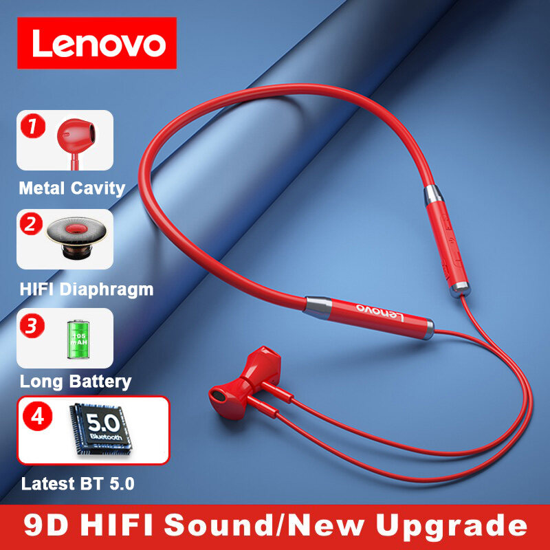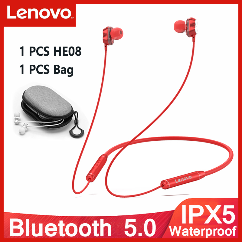 - Brand: Lenovo - Model: HE06/HE08 - BT Version: V5.0 - Color: Black/Red - Battery: 105mAH - Playtime: >10h(at 50% volume) - Speaker Diameter: 10mm - Standby time: About 120h - Wearing Way: In-ear Neckband - Effective Distance: About 10m(barrier-free)