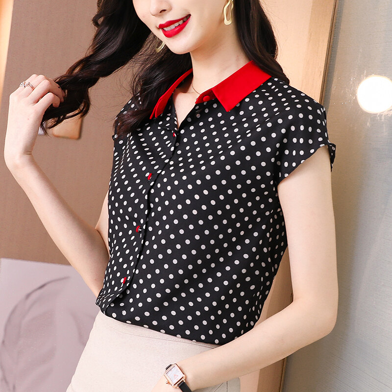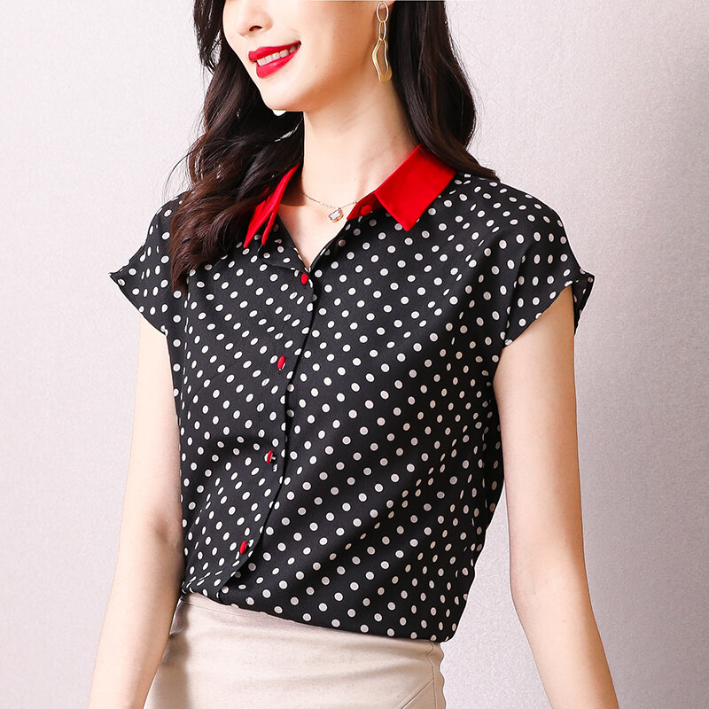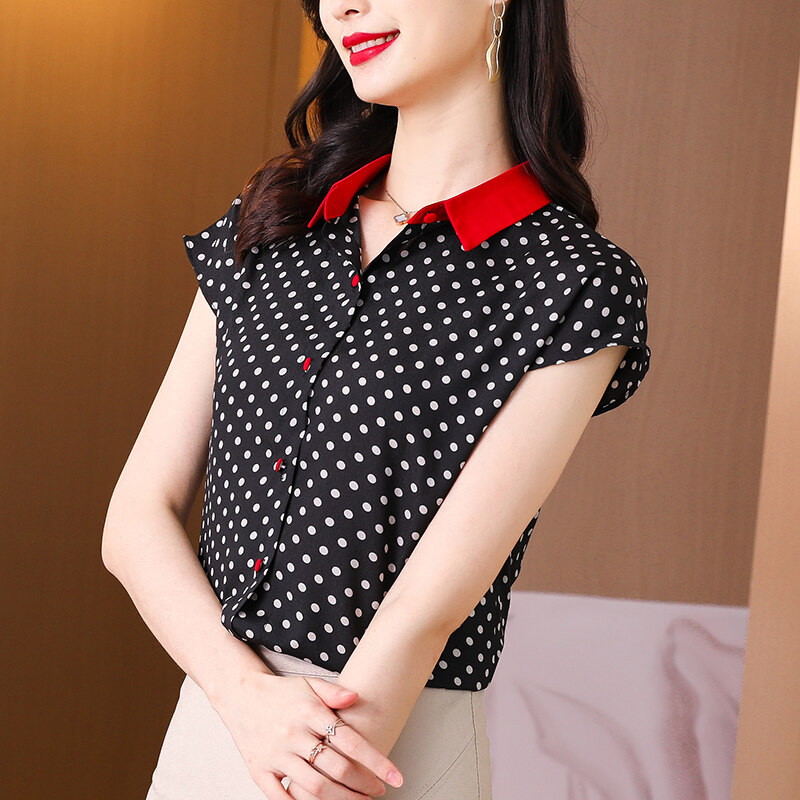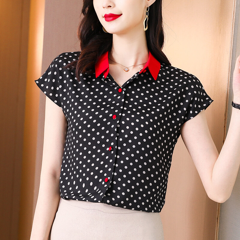 AFEG Korean style women's short-sleeved contrast color polka-dot elegant blouse for women
