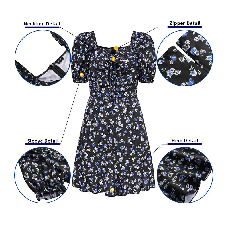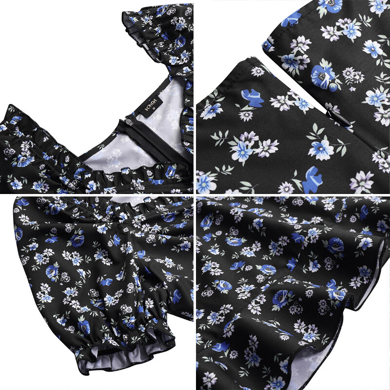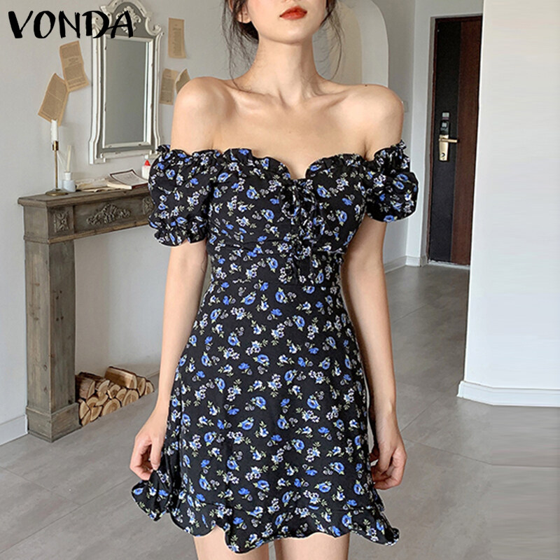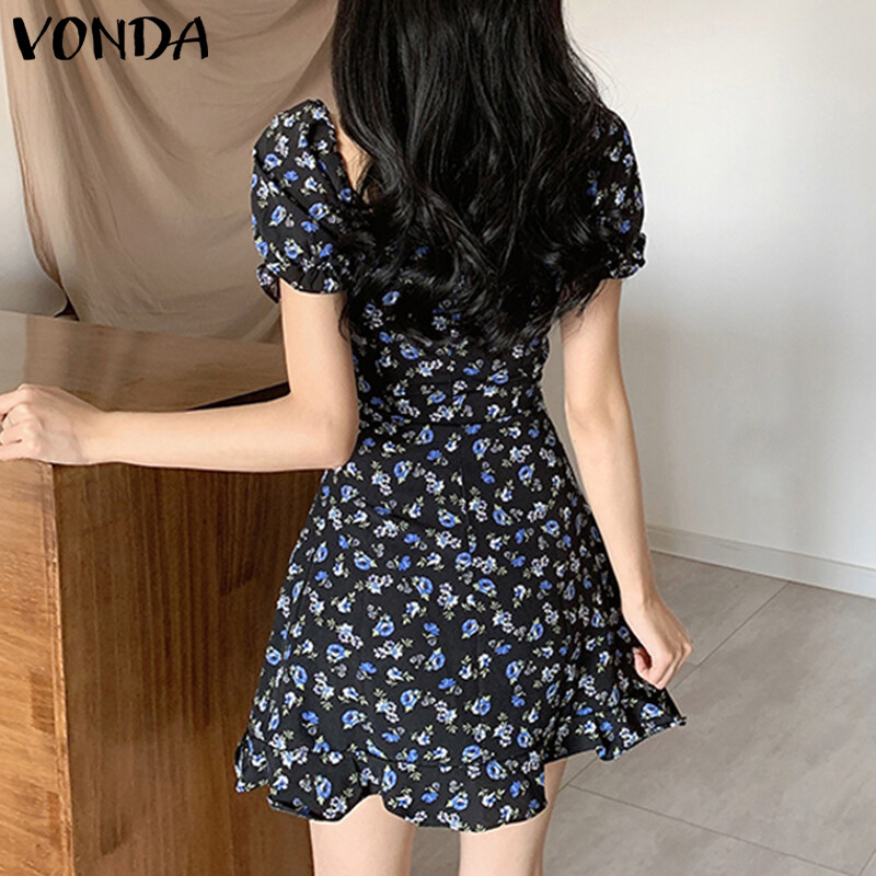 VONDA Womens Summer Puff Sleeve Mini Dress Printed Floral A-Line Dress Sundress (Korean Style)