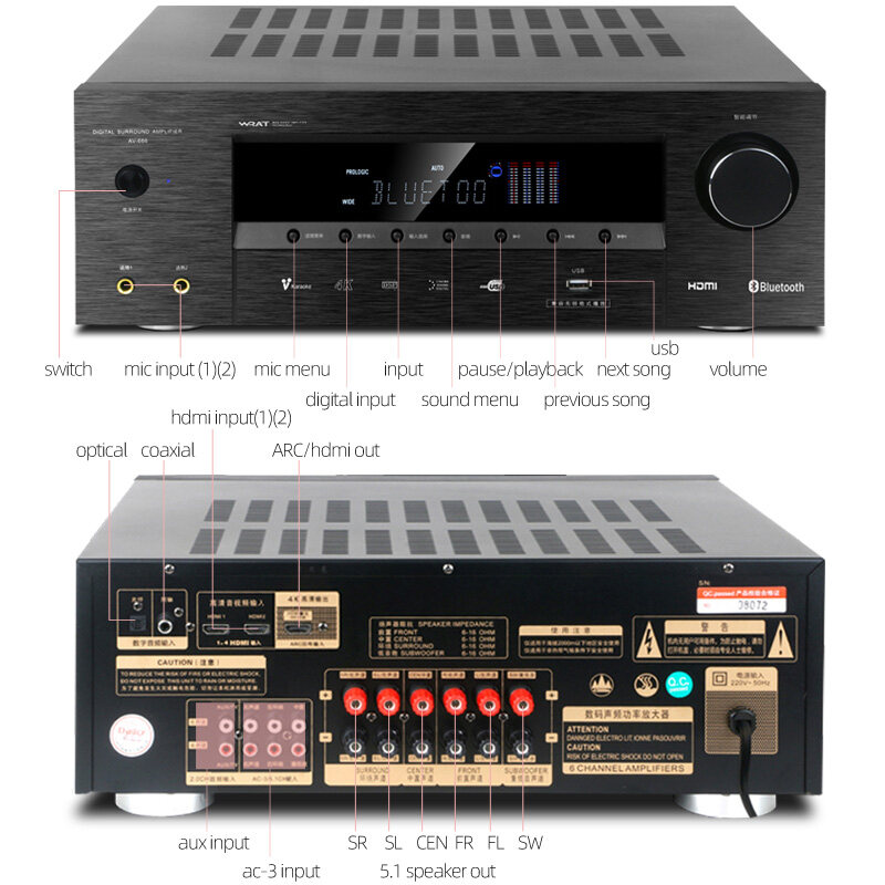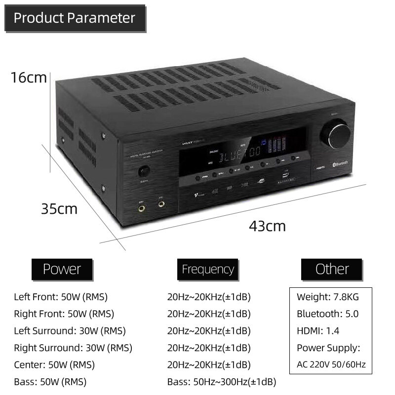 Amplifier can only be used with 220V~240V 50Hz/60Hz AC power supply. Support 4-8 ohm speakers.Built-in professional kalaok chip. Improve the microphone input sound effect.Front right channel: 50W / Front left channel: 50W.Surround right channel: 30W / Surround left channel: 30W.Center channel: 50W / Bass channel: 50W.In addition to Bluetooth, you can use a variety of ways to connect your player (including televisions, mobile phones, computers, projectors, etc.).1. You can use the hdmi/coaxial/optic audio cable to connect TV.2. You can use a 2 to 2 audio cable to connect your TV's RCA audio output jack.3. You can use 1 to 2 audio cable to connect your TV headset jack.This amplifier supports lossless music playback, you can play multiple formats of music via USB input (including APE/FLAC/MP3/WMA).