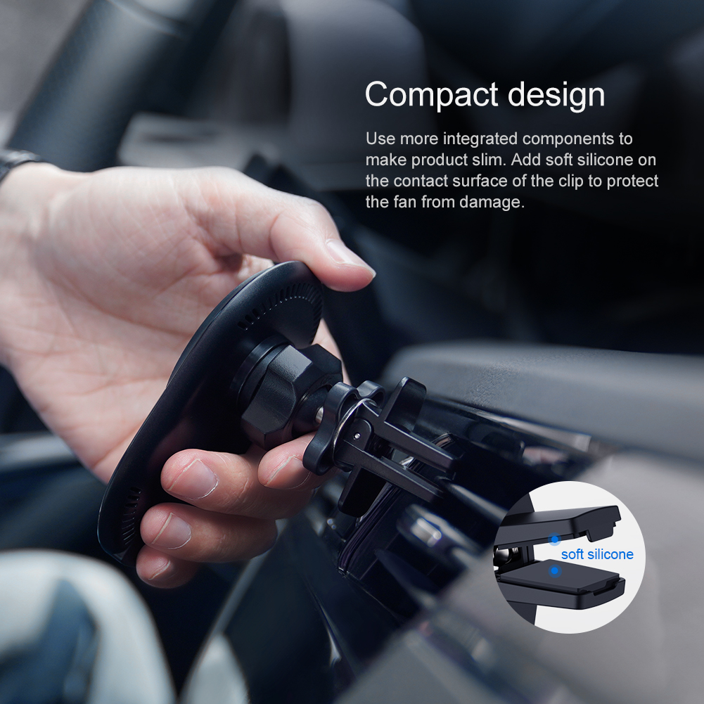 Fast Wireless Charging, Safe DrivingFor iPhone 12 & 13 Series*Note: It's suggested to use with iPhone 12 or 13 series only or with magnetic case.Do note that it can work with Android phone that support wireless charging. Just need to get a magnetic ring sticker to allow it to stick to the holder.Charge on contact - 2 in 1 function, magnetic charging and car holder. Navigation and fast wireless charging work simultaneously, one hand operation, safe driving.Strong Magnet - Ring magnets are reasonably distributed to form a closed magnetic field, gives a 900g of suction. It's very stable even in bumpy road conditions. 900g of suction is equivalent to the weight of 4 iPhone 12 Pro Max.*The closed magnetic field doesn't affect mobile signal.Intelligent Fast Wireless Charging - Intelligently adapt 7.5W fast wireless charging for iPhone 12 & 13 Series.360 degree rotation - with a 360 swivel ball, you can easily adjust different viewing angles.Stable and safe charging - The heat dissipation holes are on the back to help speed up internal air flow to keep constant temperature.Upgraded knob-type fixing clip - According to different thickness of air outlets in cars, you can adjust the clip position.Compact design - Use more integrated components to make product slim. Add soft silicone on the contact surface of the clip to protect the fan from damage.Multiple Protection - Overvoltage protection , overcurrent protection, ESD protection, short circuit protection, FODWidely compatibility - The clip is suitable for the majority of air outlets of cars, easy to install.