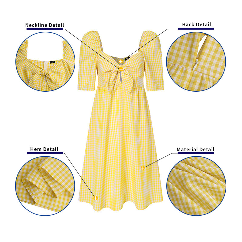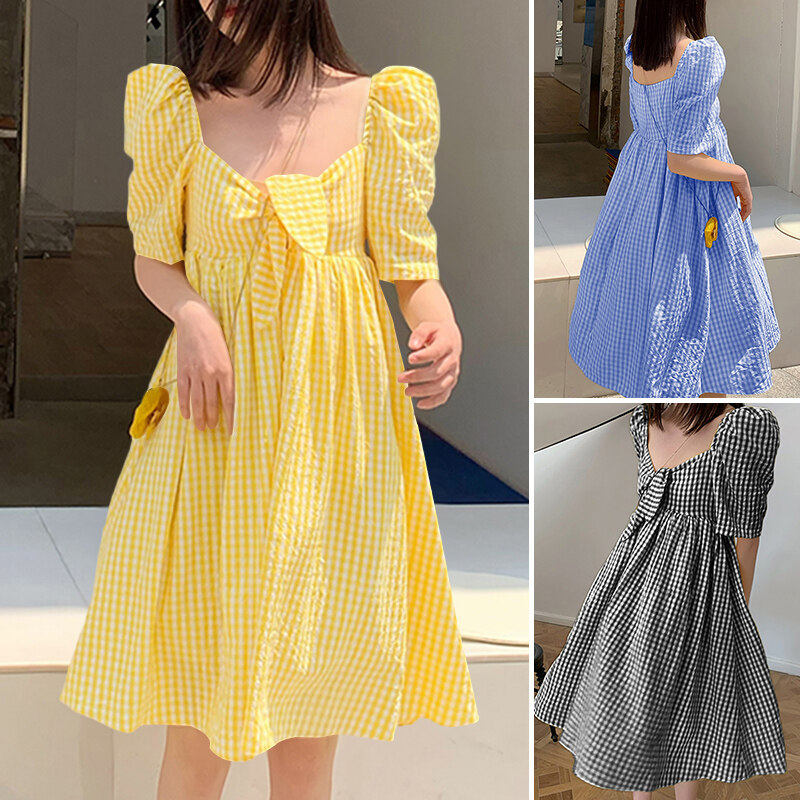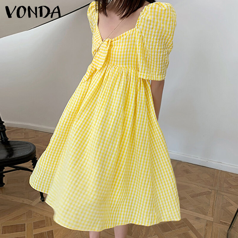 VONDA Womens Summer Shirt Dress Puff Sleeve Sundress Plaid Printed Casual Tunic Dress (Korean Causal)