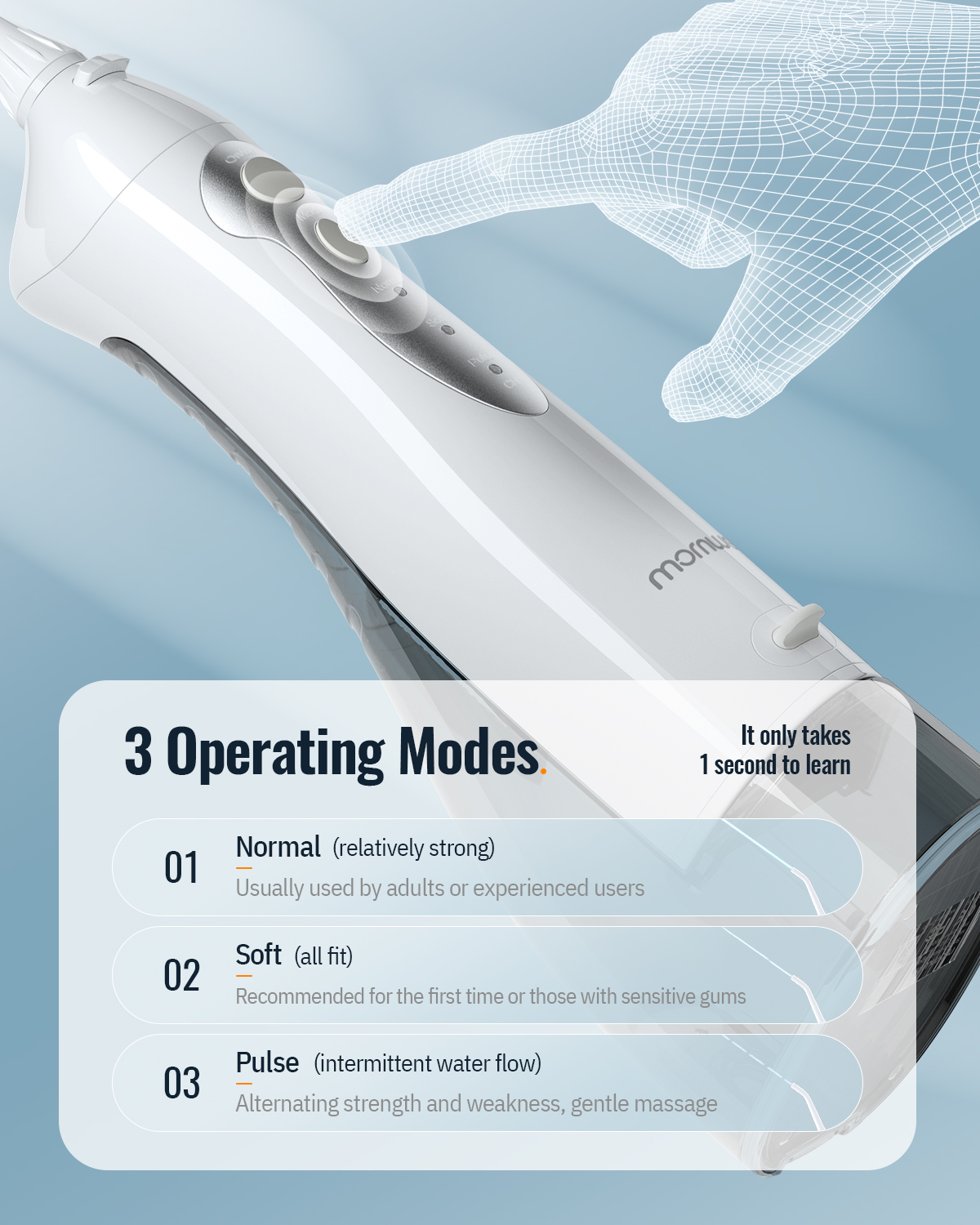 • 【3 Clean Modes with Memory Function】The cordless water flosser has Normal, Soft, and Pulse modes to meet various oral care needs, deeply clean every corner precisely, remove food debris, prevent bad breath, dental calculus, dental plaque, and gingival bleeding. Memory Function helps keep on with your preferable mode for next use.