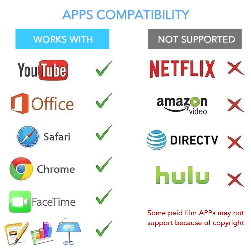 --1. WON'T work with the following applications which with "HDCP" video copyright protection: Netflix, Amazon Prime videos, Hulu, Comcast tv, Xfinity, Vudu, DIRECTV, Cox, iTunes, etc.