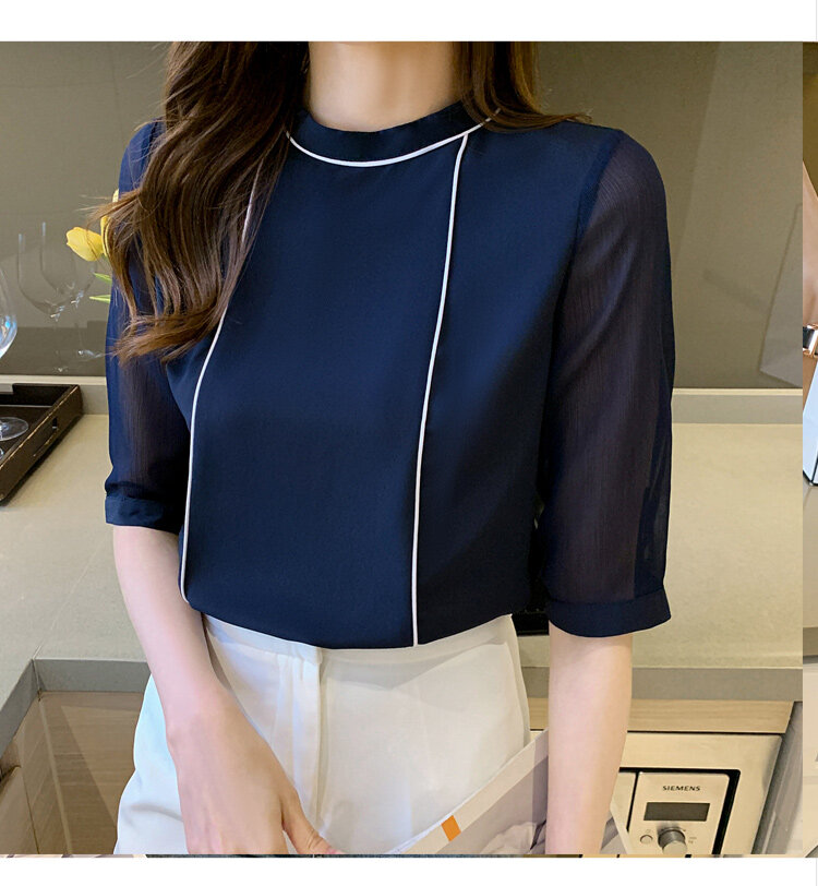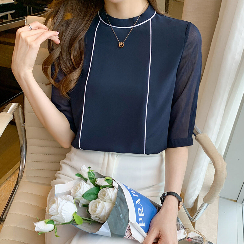 AFEG new Korean round neck fashion simple loose wild chiffon short-sleeved blouse for women