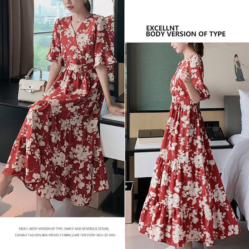 INWPLLR Japanese Style Women Dress Fashion Flower Printed Dress Korean Elegant Long Red Dress 2021 Summer Casual A-line Dresses Female