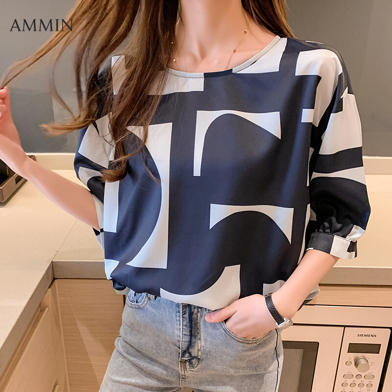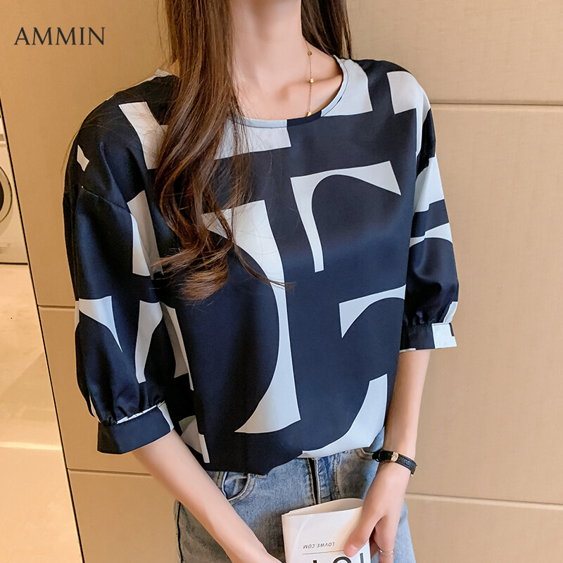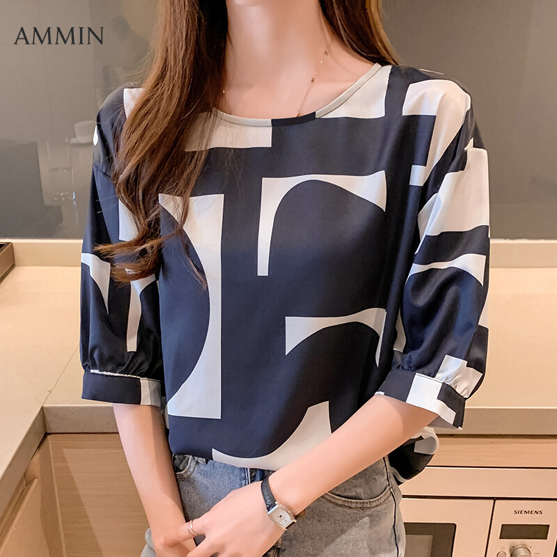 AMMIN Tops 2021 summer new style irregular pattern printing short-sleeved fashionable elegant temperament blouse women's Korean version of simple round neck printing light mature design all-match