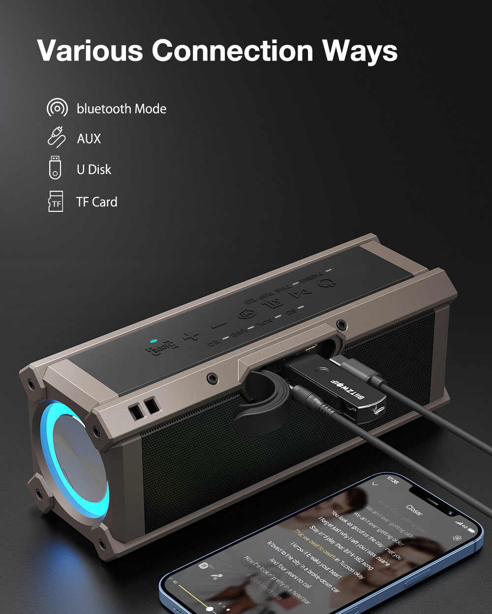 【Stunning sound】The speaker can produce sound before and after, the intelligent chipset, digital audio processing, to ensure sound balance, excellent resolution and frequency response range.【Wireless interconnection】Two interconnected wireless headphones, you can play TWS wireless stereo outdoors.【Dual Diaphragm】RGB lights will glow with the beat and with the rhythm.【Three EQ Modes】Standard(No lights),gentle mode(green light),Enhanced mode(White light).【IPX5 Waterproof】Prevent speaker from water splashes and jets.【Long Endurance】5000mAh capacity, long battery life, and also an emergency mobile power supply, which can charge your mobile phone and make your device full.【Various Connection Ways】Bluetooth Mode,AUX,U Disk,TF Card and so on.【Portable to Carry】You can take it for outdoor sports, such as polar camping, mountain climbing, cycling, skateboarding, etc. It is very convenient.Light weight and hanging design allow you to enjoy melody on the trip.