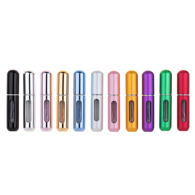Multicolor 5ml Portable Practical Pump Refillable Spray Bottle Travel Empty Perfume Bottle Atomizer Aluminum Liquid Container Description: The refillable travel perfume bottle is replenished directly from a standard perfume bottle in seconds. The innovative "pump fill" system perfectly transfers your fragrance without spilling or damaging exposure to the air! Feature: 1. Small size, easy to carry and store. 2. In a clean bottle, it's easy to see how much perfume you have left. 3. Very easy to use and can be refilled in a few seconds. 4. Easy and convenient - Just press the bottom on your favorite perfume and continue clicking until you refit it. 5. Perfectly store some of your favorite perfume/aftershave/makeup remover in a smaller container instead of taking the whole bottle with you on vacation. Specification: Product size: 8.1*1.7*1.7cm / 3.2*0.7*0.7in Material: aluminum (bottle body) + PP(inner bottle) Product capacity: 5ml Product weight: 15g Product color: Black, Blue, Bright Blue, Bright Gold, Bright Pink, Bright Silver, Gold, Purple, Pink, Rose Red Use: 1. Take off your perfume bottle. 2. Put the bottoms of the perfume bottles on top of our perfume bottles. 3. Enjoy your mini spray bottle. Note: Due to the different monitor and light effect, the actual color of the item might be slightly different from the color showed on the pictures. Thank you! Please allow 1-3mm measuring deviation due to manual measurement.