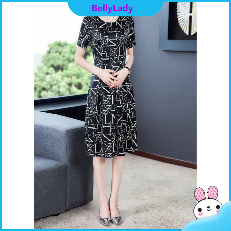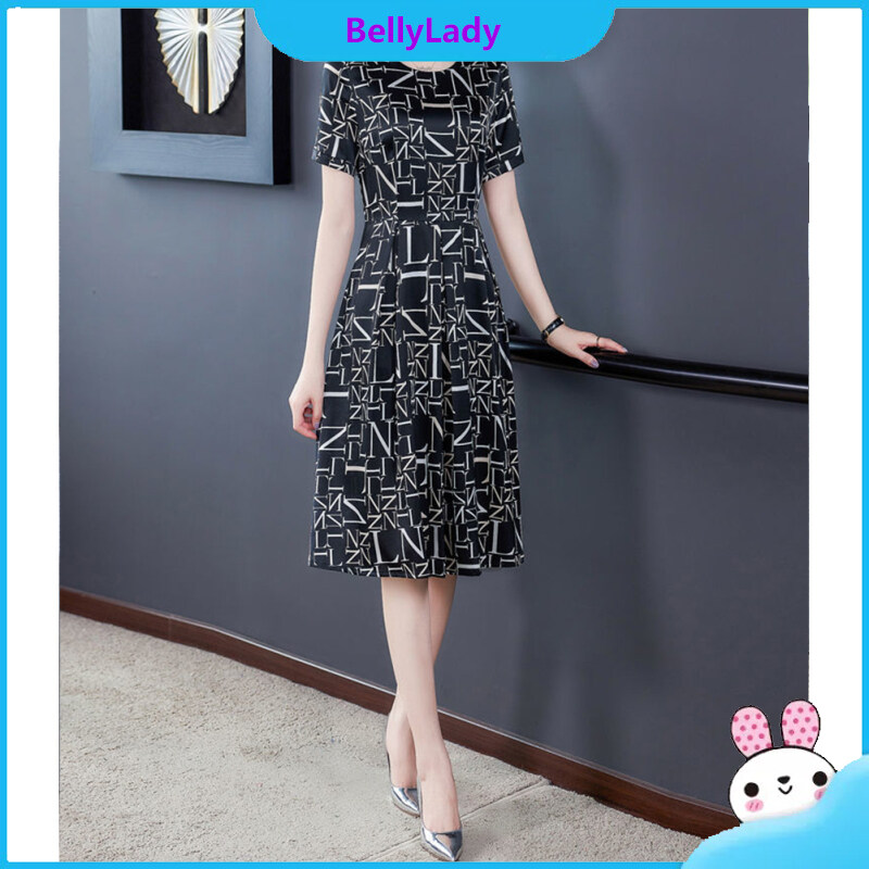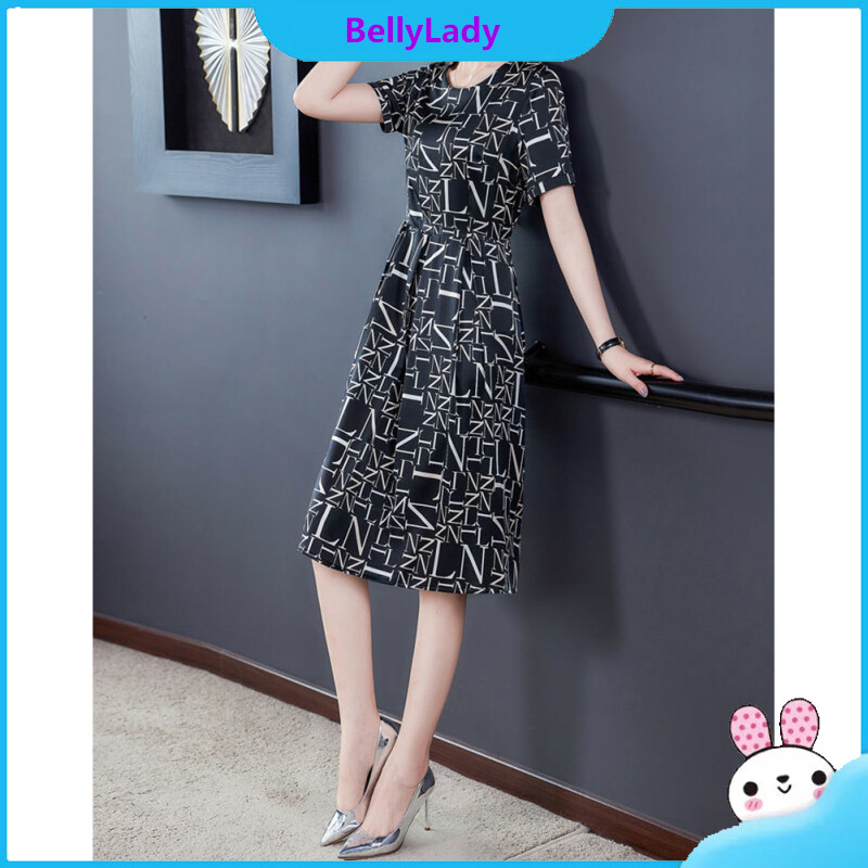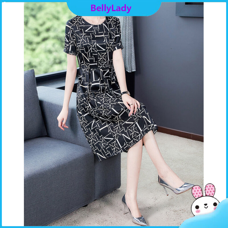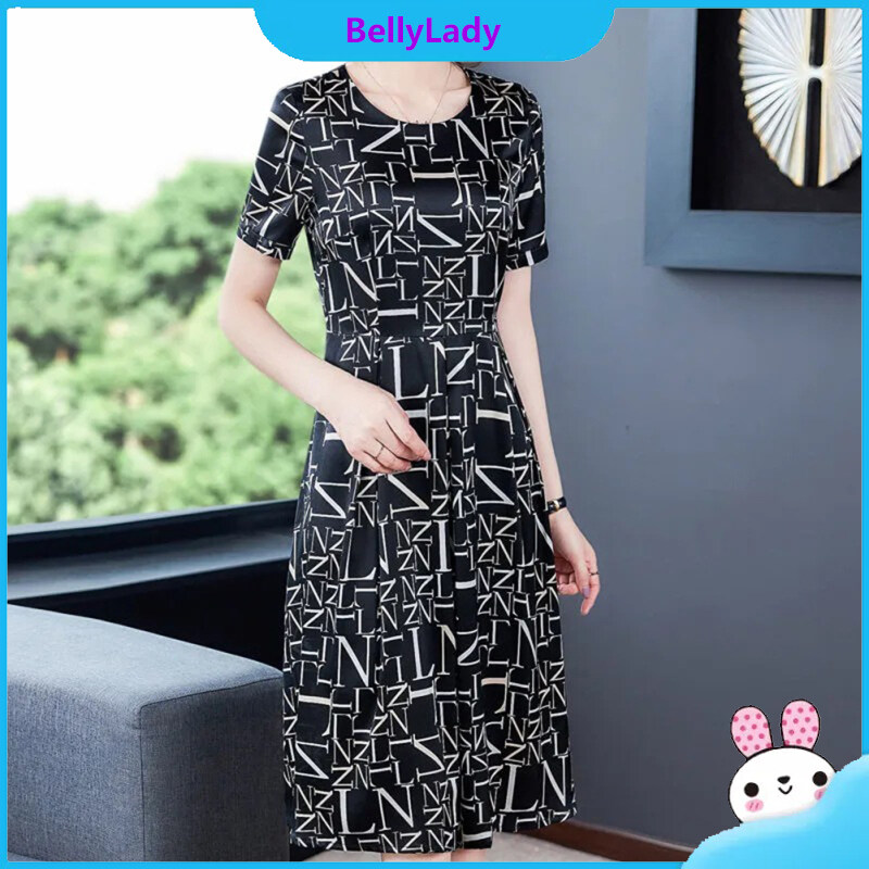 Women Ice Silk Dress Loose Slim Letter Print Round Neck Pullover High Waist A-line Skirt Mid-length Skirt Short Sleeve Dress