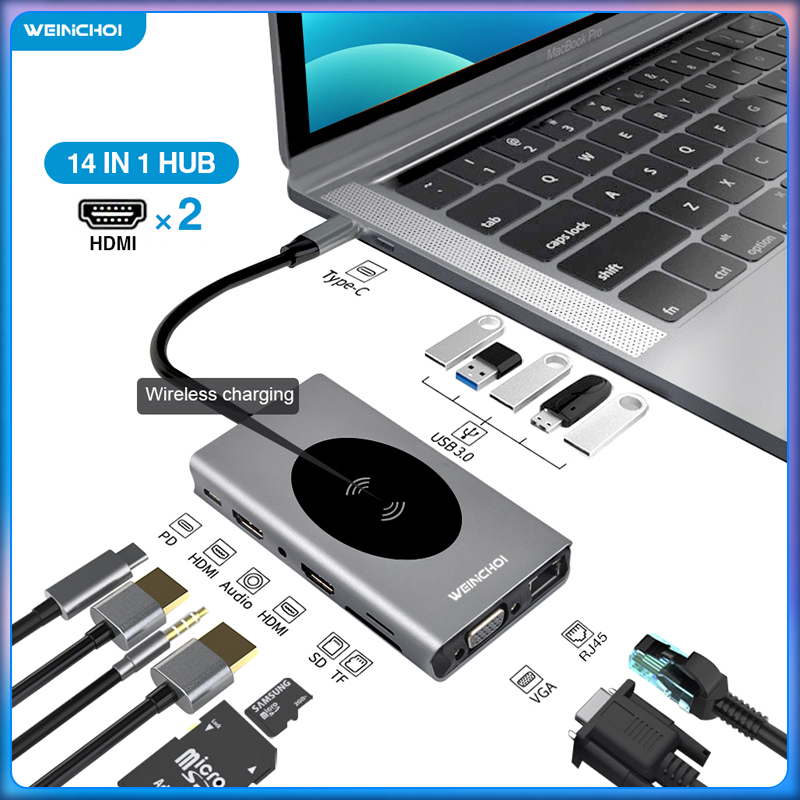 WEINICHOI 14 in 1 Docking Station USB Type C HUB To HDMI-Compatible Adapter OTG Vga RJ45 Lan Multi USB PD 3.0 USB-C for MacBook Pro Air 4KSplitter