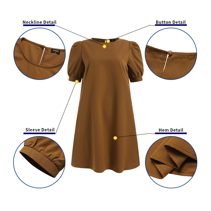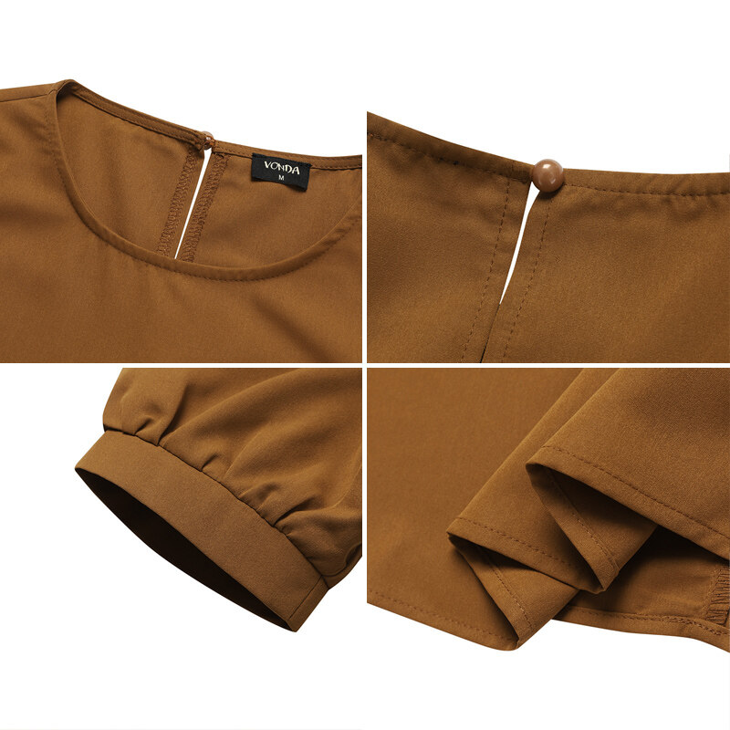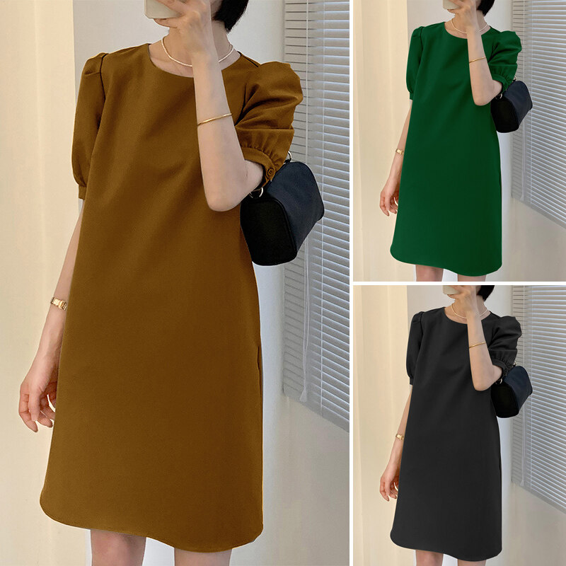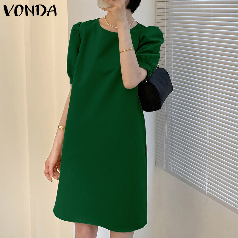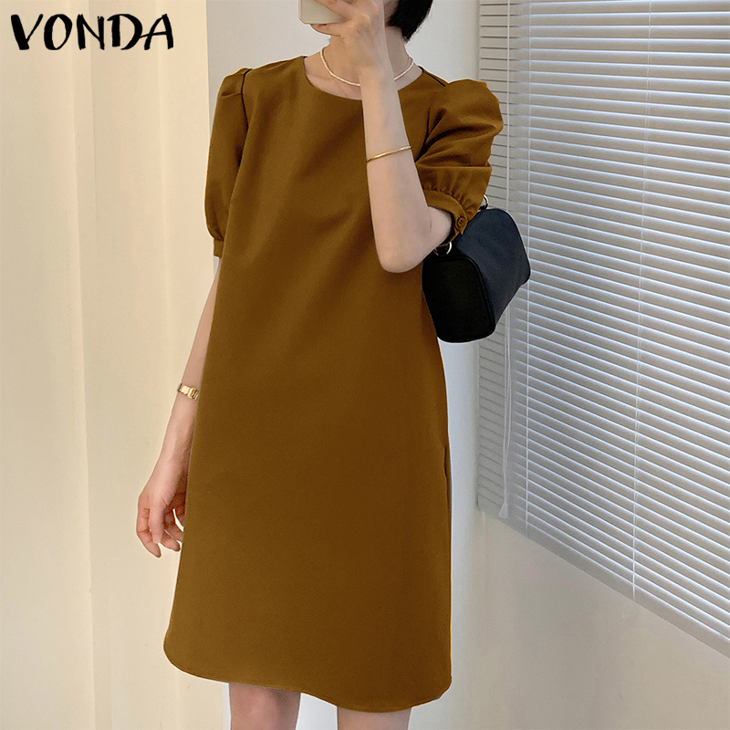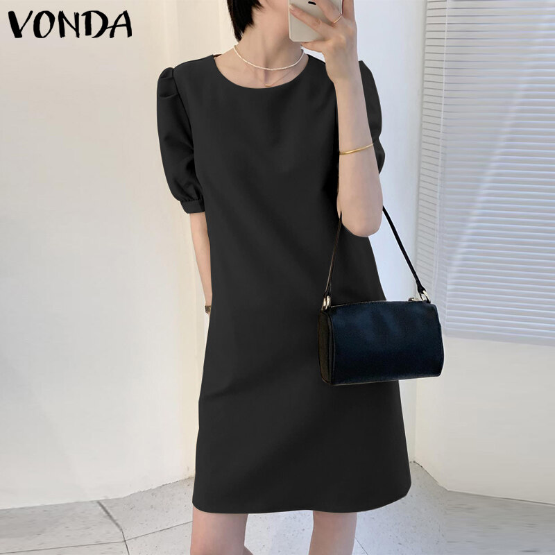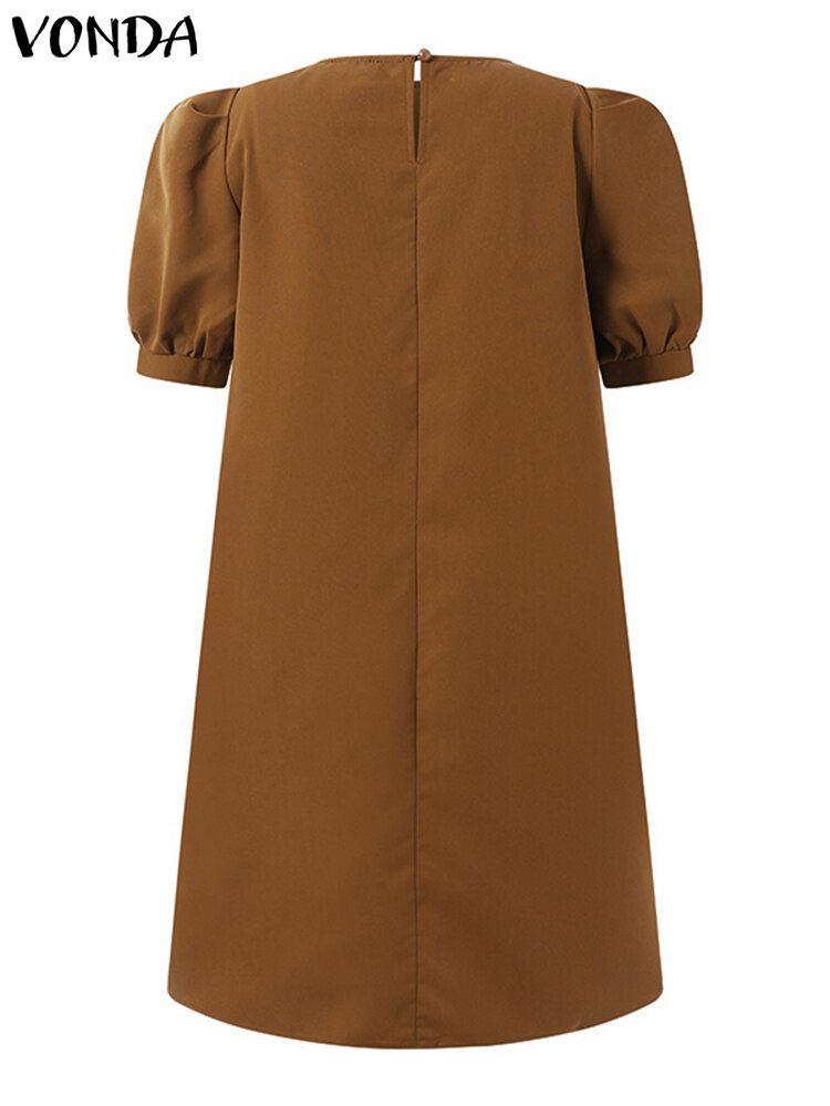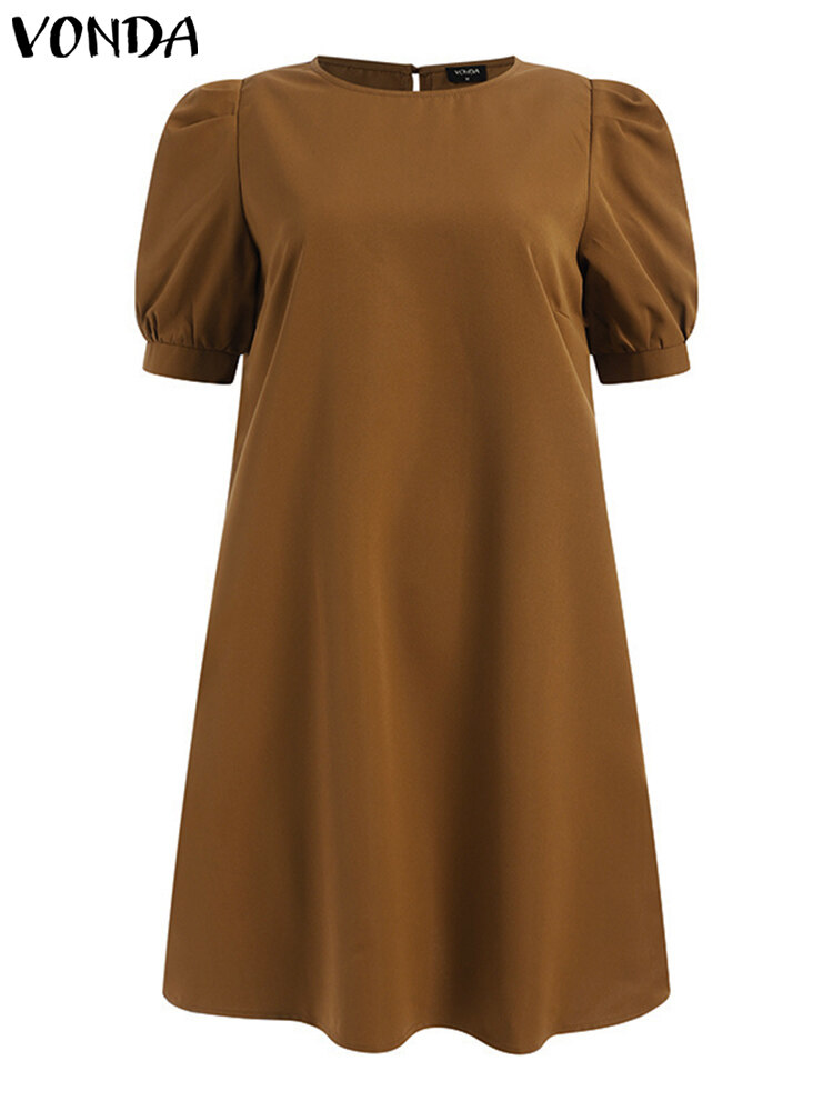 (Korean Causal) VONDA Womens Puff Sleeve Shirt Dress Holiday Casual Sundress Retro Solid Long Tops