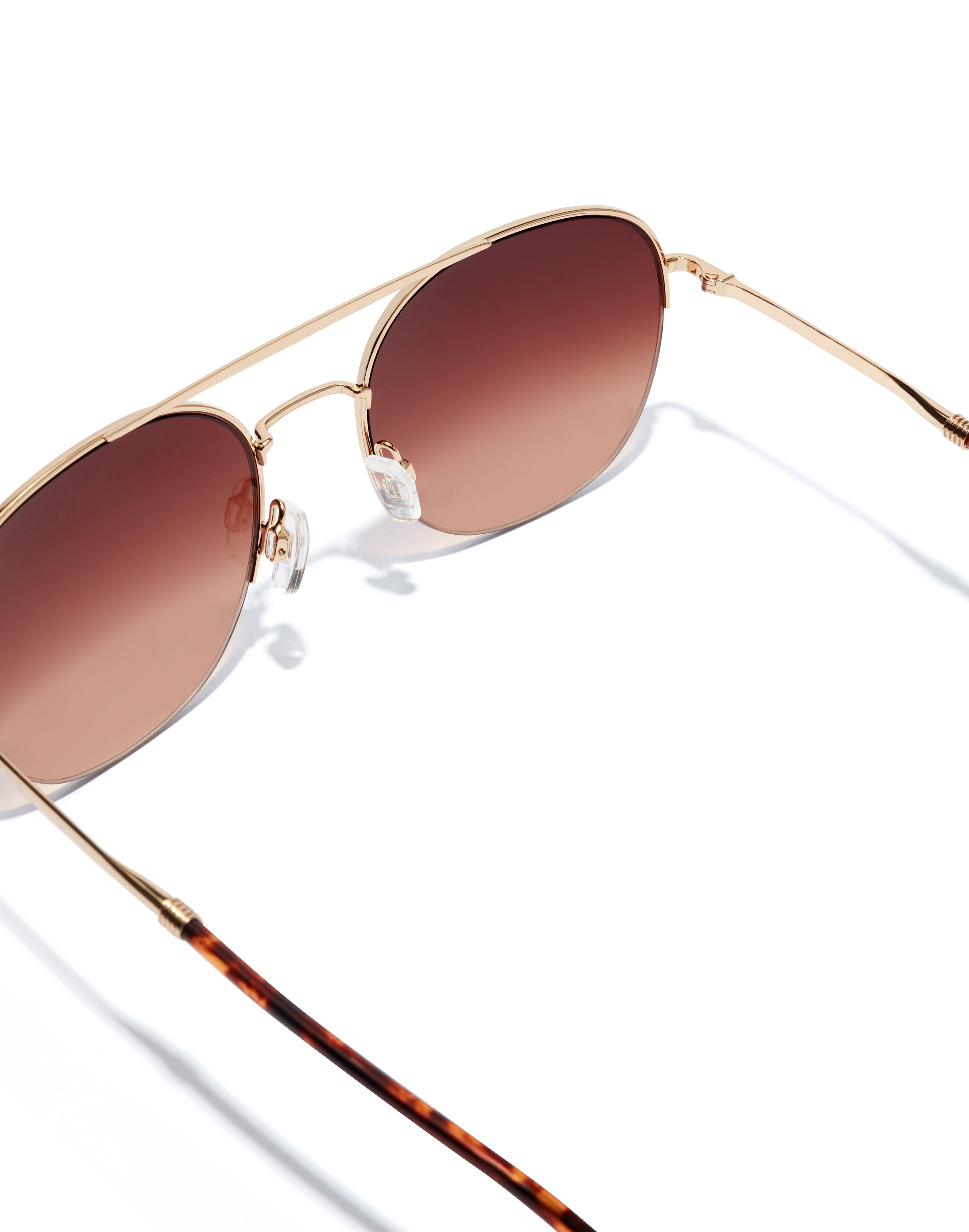 A rounded aviator-style metal frame in polished gold with double-bridge, slender temples with elongated, tortoiseshell ear pieces, offset half-rims and gradient terracotta lenses.