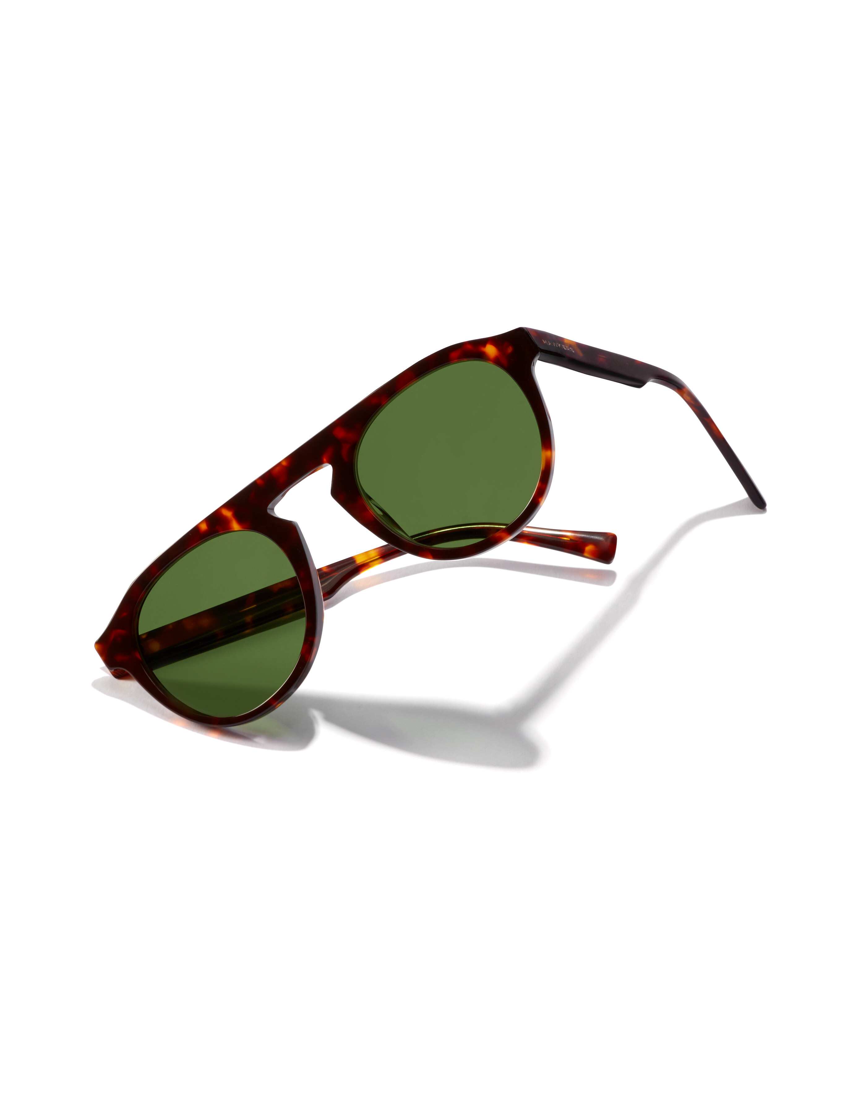 The unconventional flat browline and truncated keyhole bridge of this model belie the simplicity of the overall design at first glance. Rounded bottle green lenses perfectly complement the shiny brown havana acetate frame.