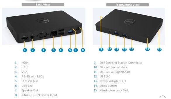 The K17A is a monitor dock model, which is manufactured by the Dell brand and compatible with Dell Precision. with 1x 7.4 mm DC-in, 1x Gigabit Ethernet (RJ–45), 1x Headset connector, 1x Line-out connector, 1x mini DisplayPort, 1x HDMI, 1x VGA, 2x USB 2.0, 2x USB 3.0, 1x USB 3.0 PowerShare