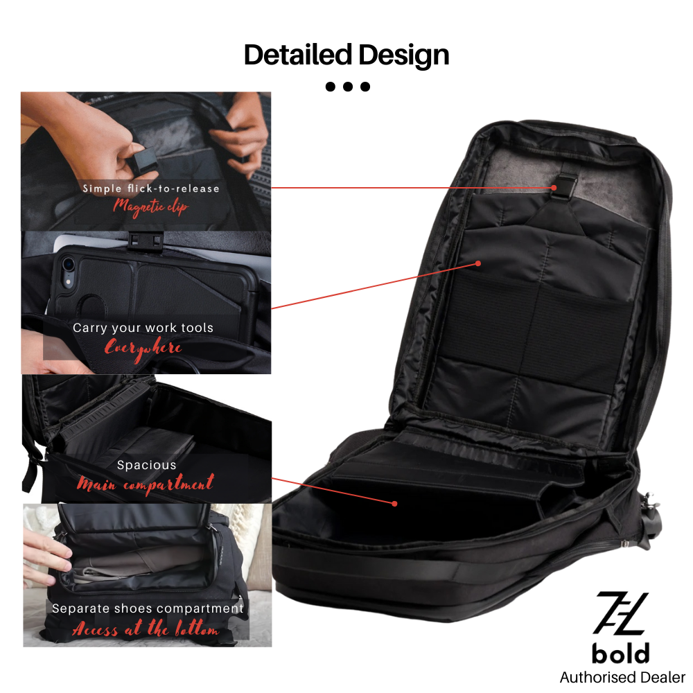 Pytho's dedicated shoe compartment is designed with a compressible flat-top design - which enables you to maximize the space regardless if you're hitting the gym.