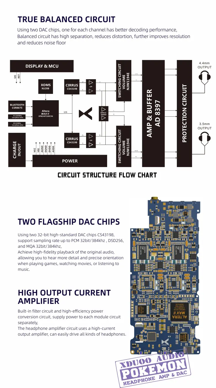 > Using two DAC chips, one for each channel has better decoding performance, Balanced circuit has high separation, reduces distortion, further improves resolution, and reduces the noise floor