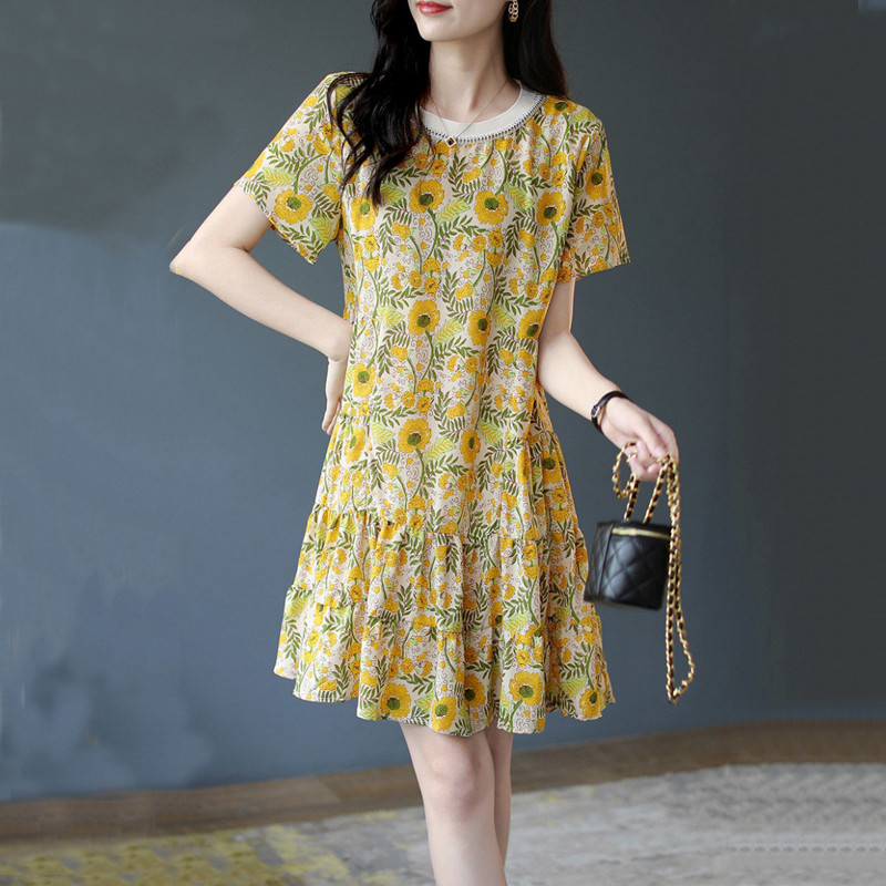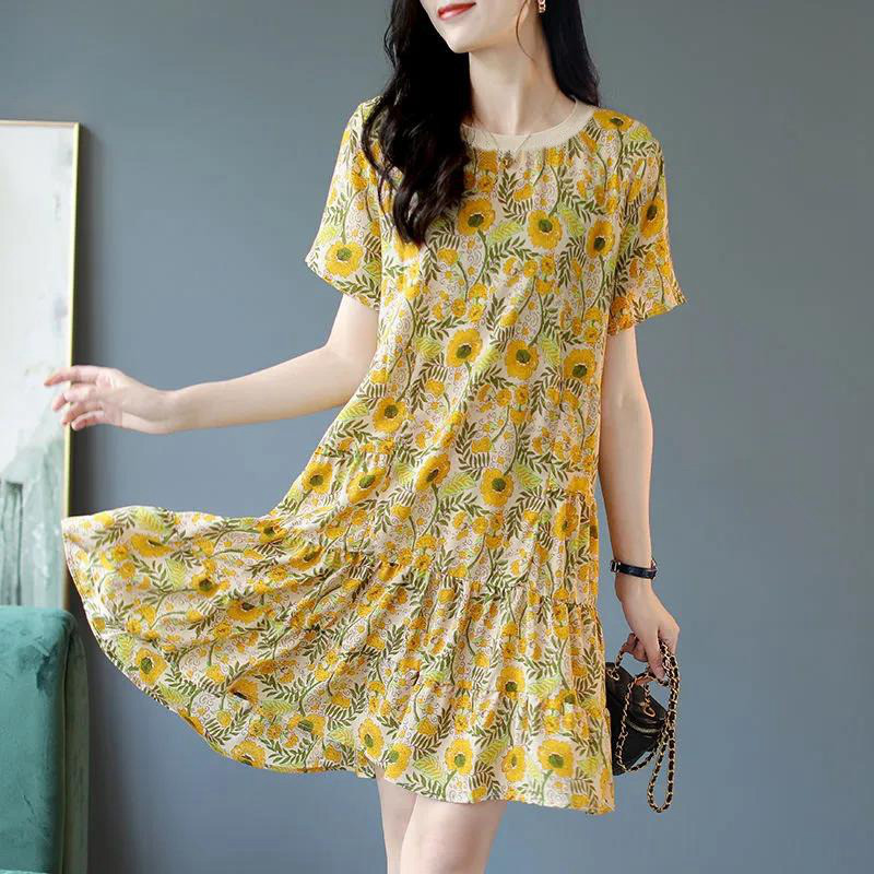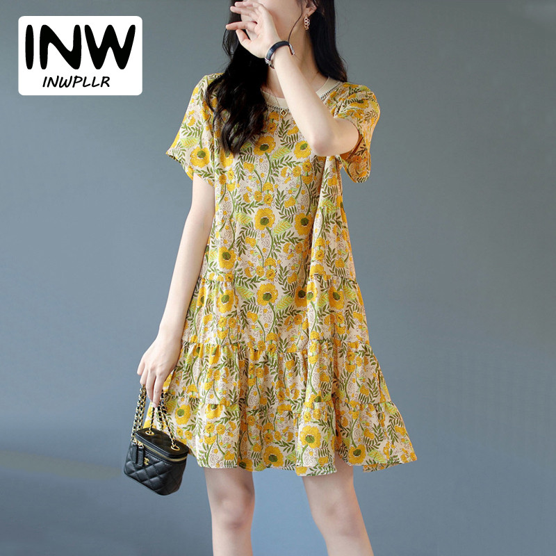 INWPLLR New Korean Dresses For Women Fashion Short Sleeves MIDI Dress Leisure Big Size Floral Printed Dress Female