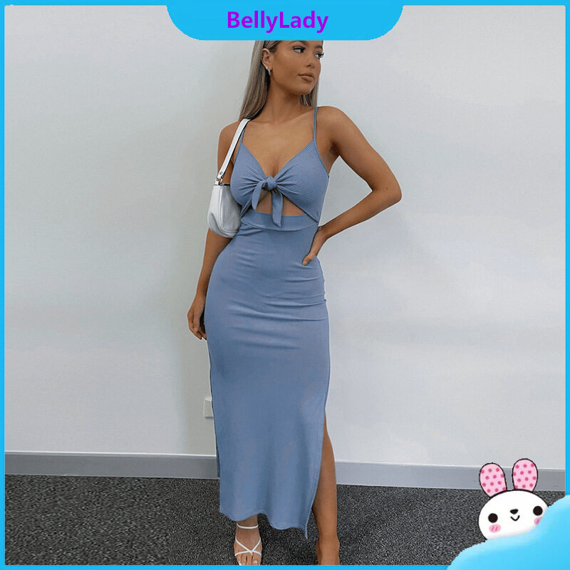 Women Suspender Slim Fit Dress Sexy V-neck Pullover Long Skirt Solid Color Lace-up Hollow Slit Dress