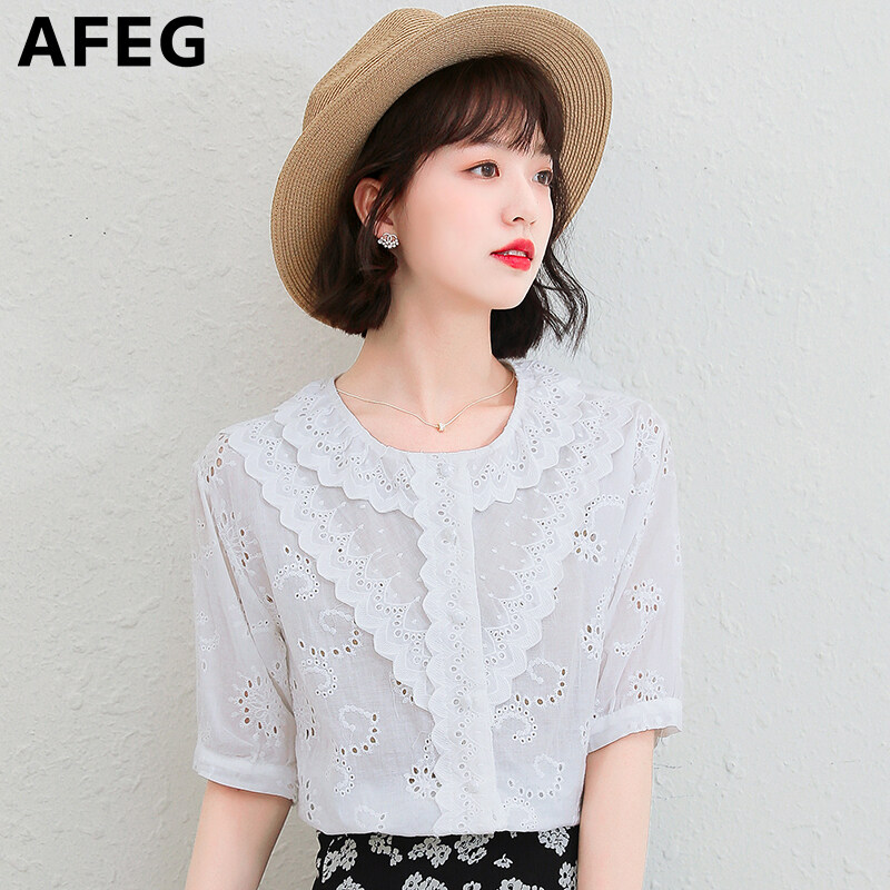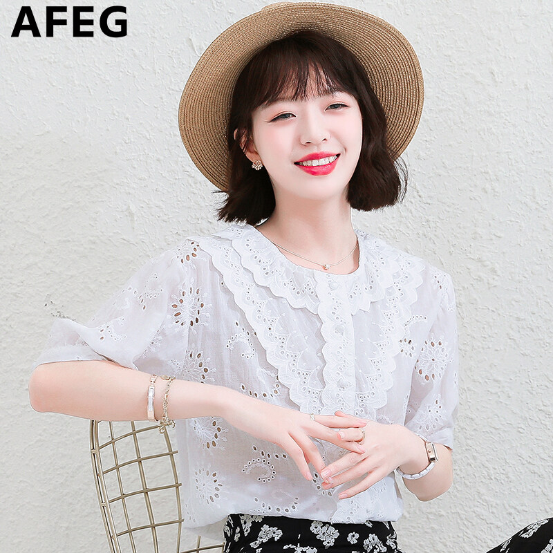 AFEG new Korean version round neck fashion loose all-match temperament embroidered cotton short-sleeved blouse for women