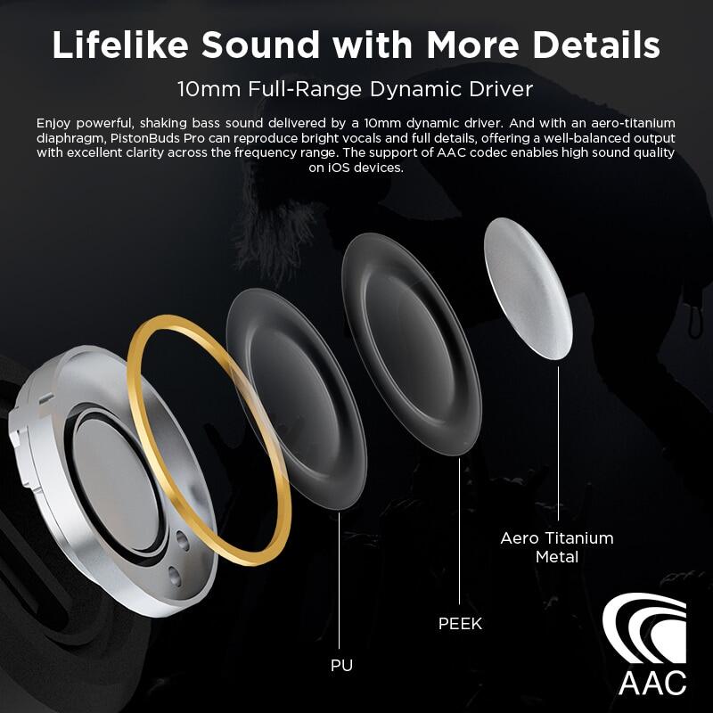 Enjoy powerful, shaking bass sound delivered by a 10mm dynamic driver. And with an aero titanium diaphragm, PistonBuds Pro can reproduce bright vocals and full details, offering a well-balanced output with excellent clarity across the frequency range. The support of AAC codec enables high sound quality on iOS devices.1MORE Signature Sound