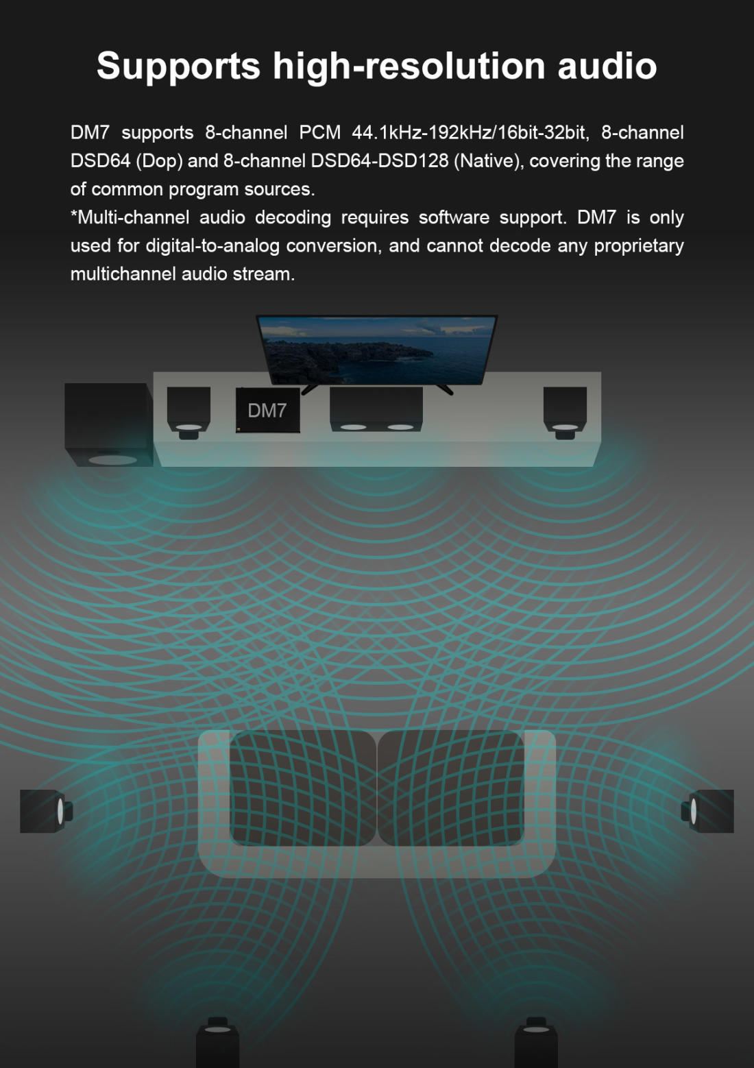 Topping DM7 supports 8-channel PCM and DSD audio signal decoding. It provides full decoding for 32-Bit/192kHz PCM and native DSD128 signals. It also supports DSD64 over the DoP profile.