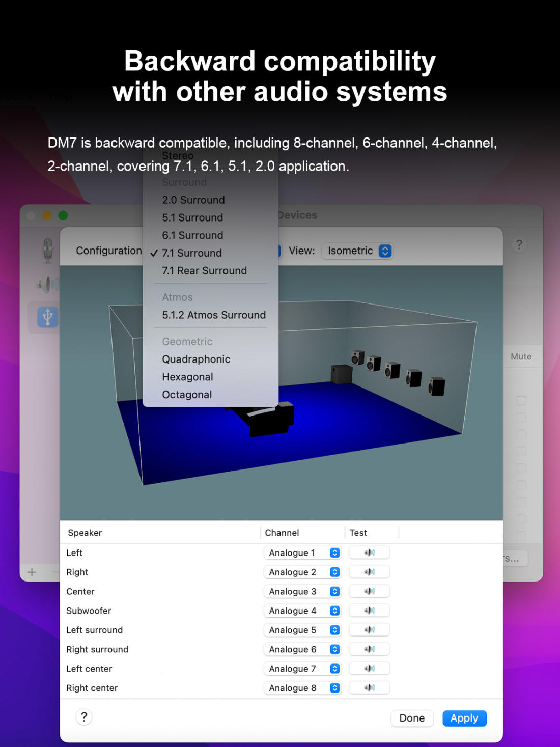 Topping DM7 is backward compatible. It can be connected to 8-channel, 6-channel, 4-channel, and 2-channel systems. You can create full 7.1Ch, 6.1Ch, 5.1Ch, and 2.0Ch setups easily. It supports both Windows and Mac devices. With Windows systems, it works in 2-ch mode until you upgrade the system with the latest driver.