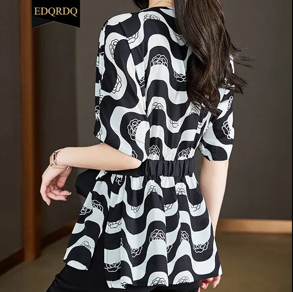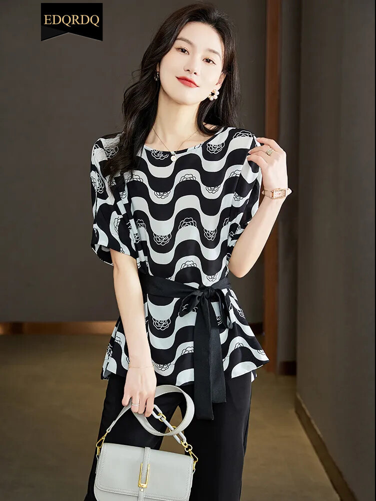 EDQRDQ Women's Boat Neck Striped Short Sleeve Peplum Tie Front Knot Casual Loose Blouse