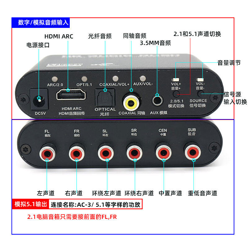 ARC/coaxial fiber input can be 5.1 hard/soft decoding, AUX input is analog 5.1 decoding