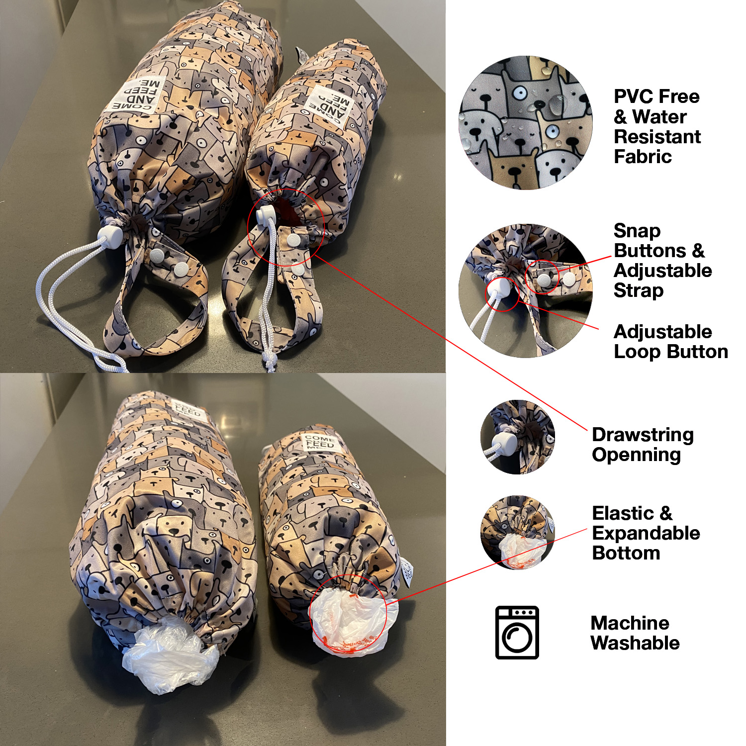 WATERPROOF AND REUSABLE: FLOCK THREE 2-in-1 plastic bag holder set is made from water-resistant TPU. It is reusable & double layered (both inner and outer) and, BPA-free, are tested to be safe for babies. The top drawstring is made from nylon rope and the bottom dispenser has an elastic band sewn in, durable with high-quality finishing, machine washable and dryer.