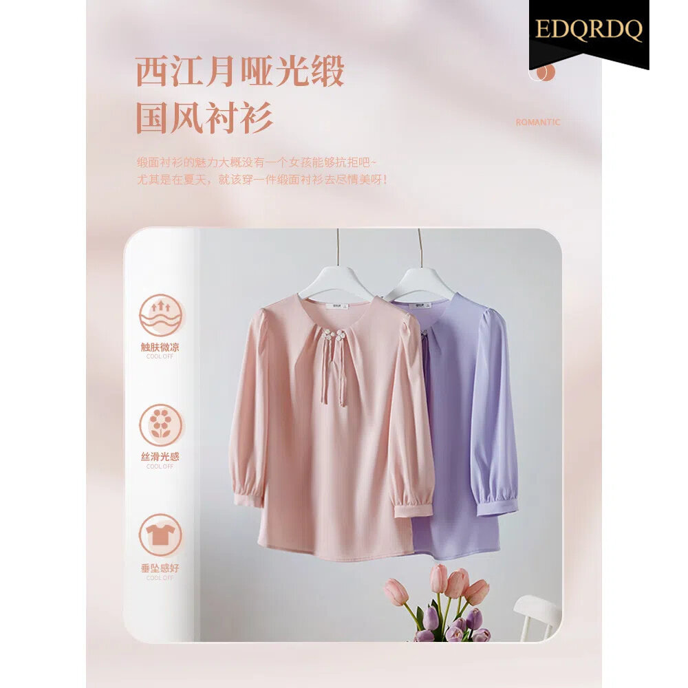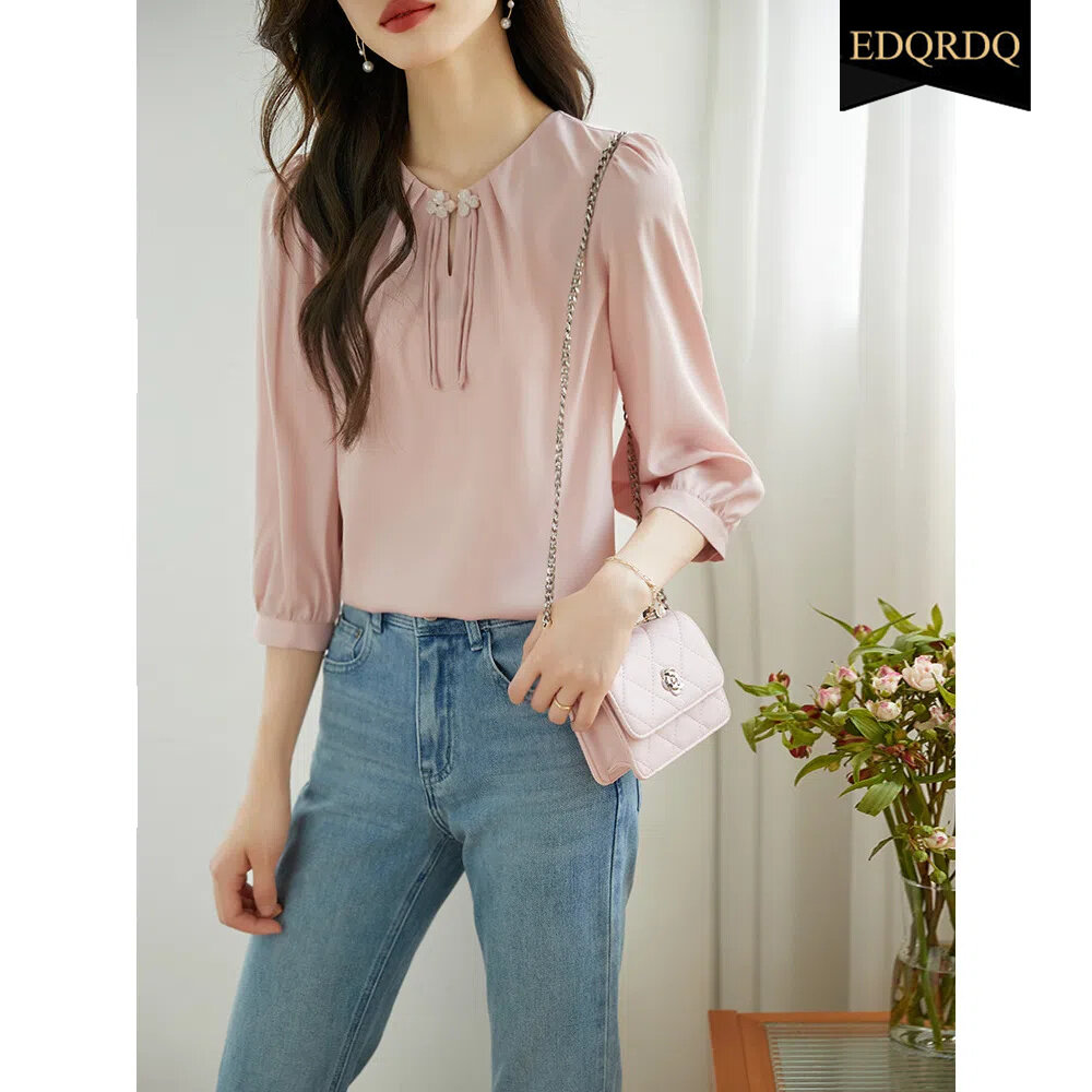 EDQRDQ Elegant 3/4 Sleeve Tops Chinese Style Strappy O Neck Blouses for Women
