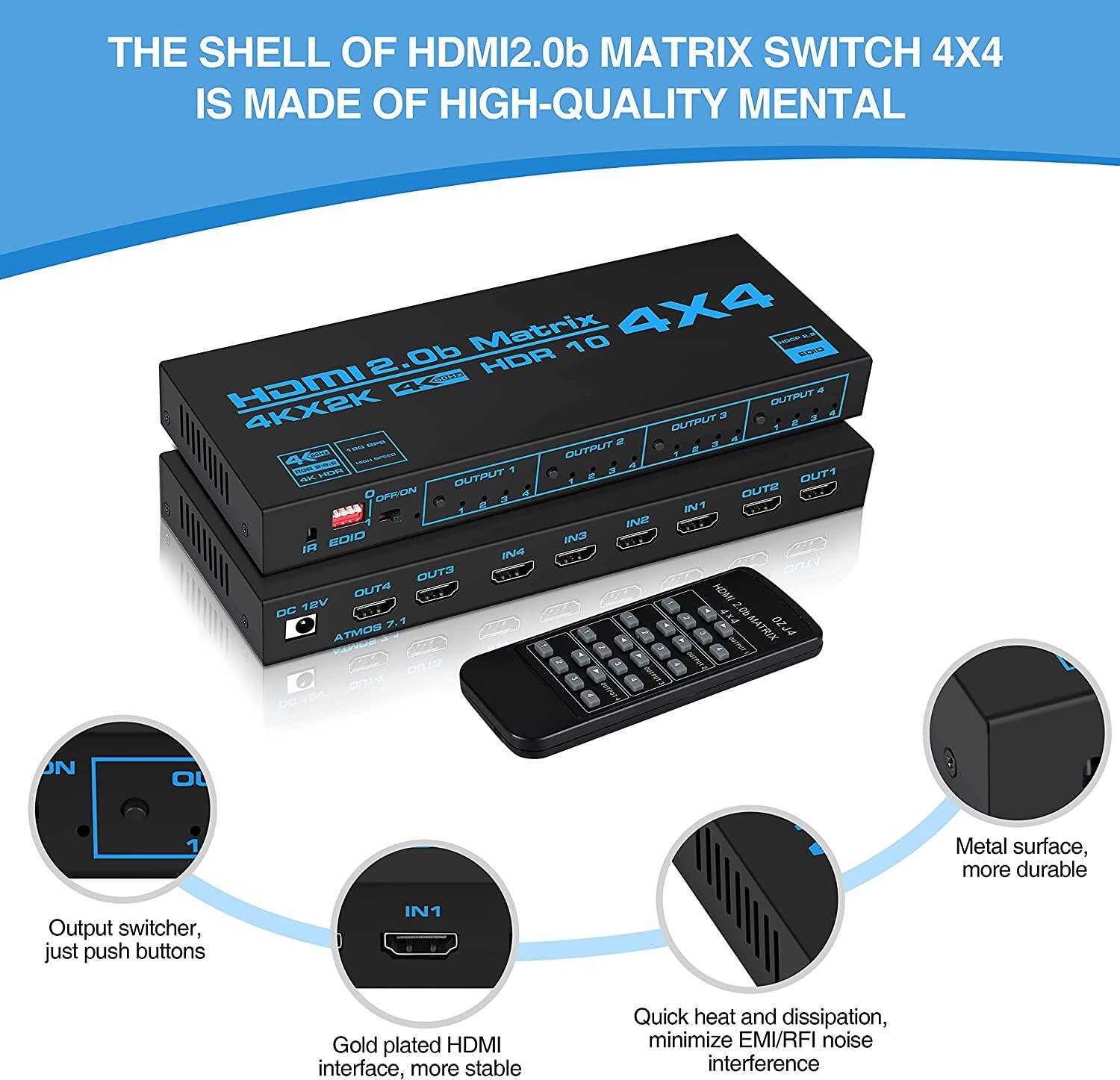 1 x HDMI 2.0b Matrix Switch, 1 x 12V AC/DC Adaptor, 1 x IR Remote, 1 x User Manual. This HDMI splitter by adding quick heat absorption and dissipation, makes more durable, and minimizes EMI/RFI noise interference.