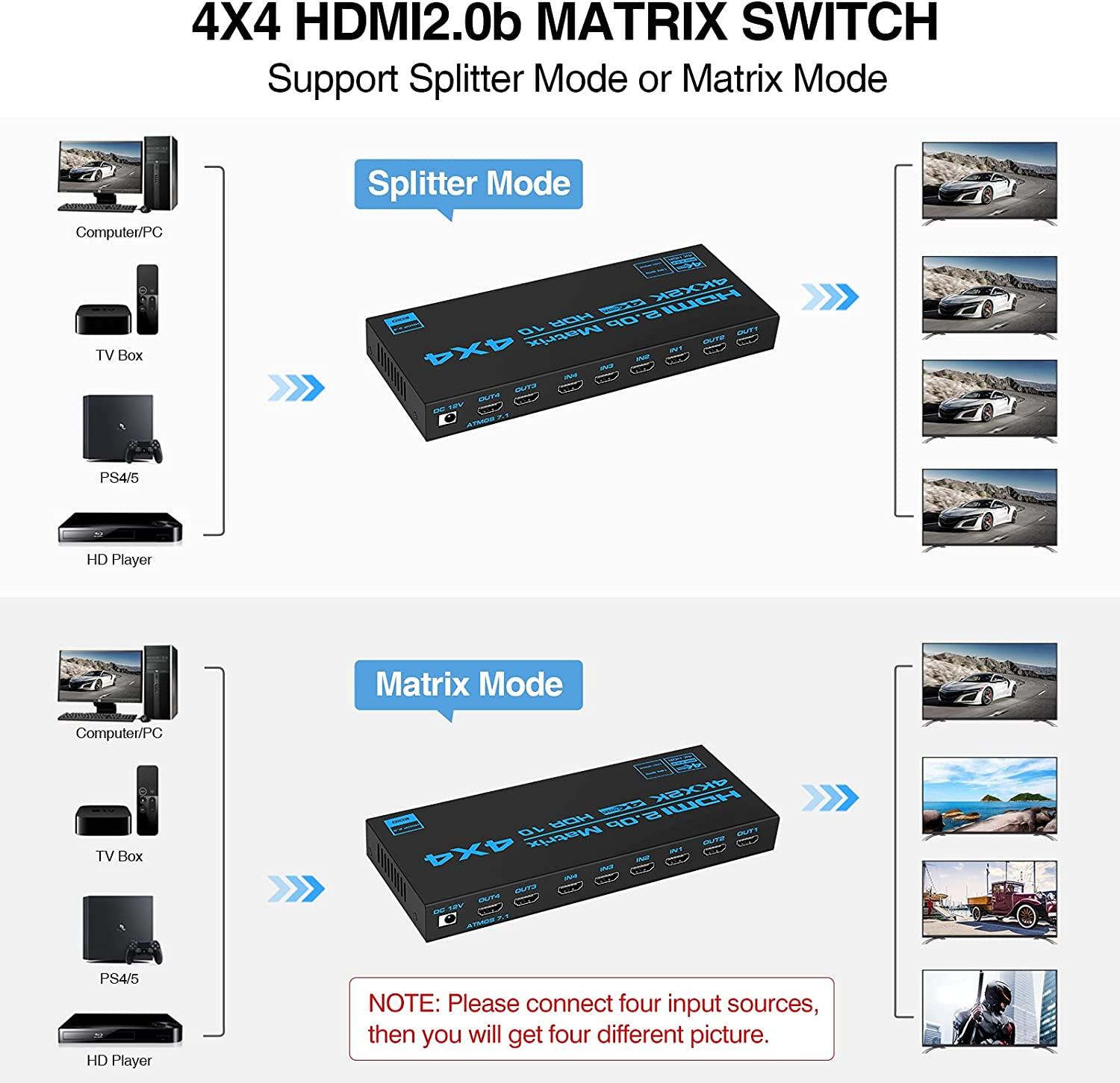 HDMI matrix 4 inputs and 4 outputs with IR remote control can connect 4 HD signal sources to 4 HD displays. Each HDMI output can share the same or the different picture, and can allows you switch or split easily to 4 HDMI compatible monitors or projectors.