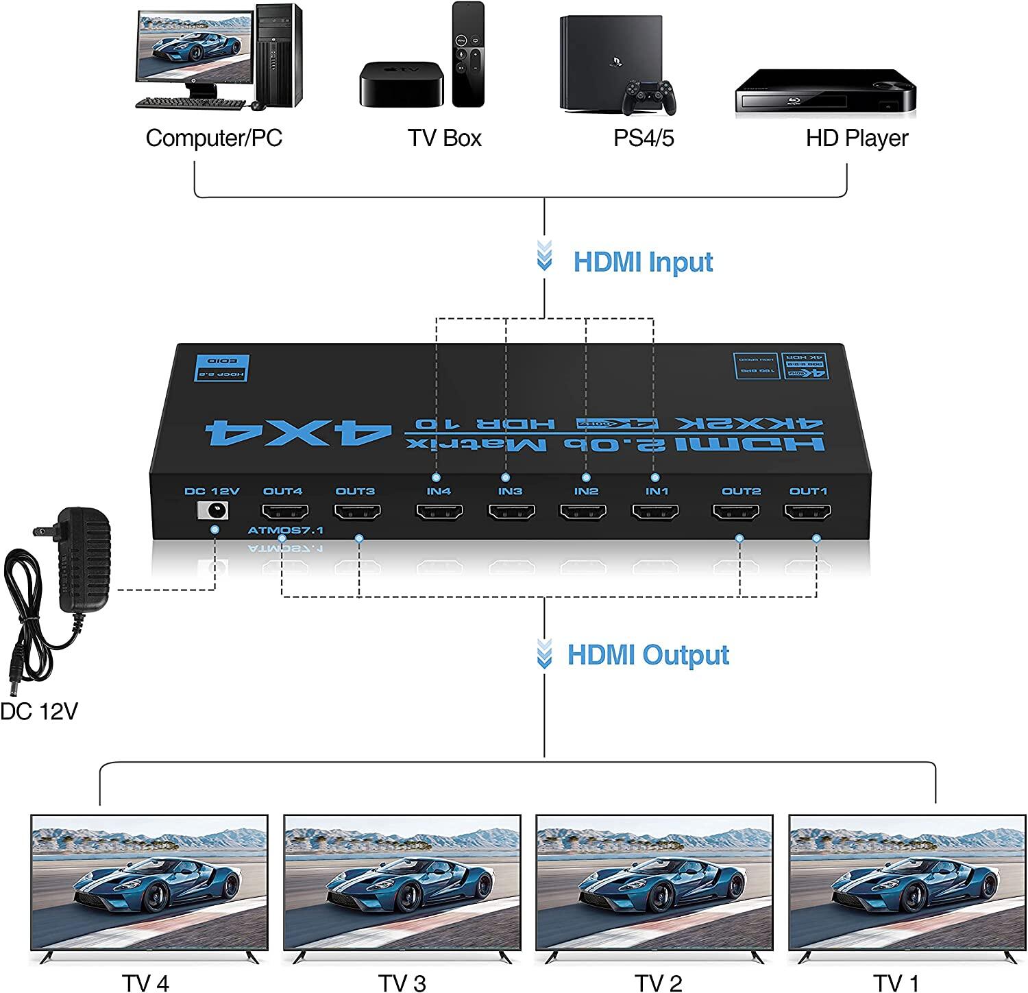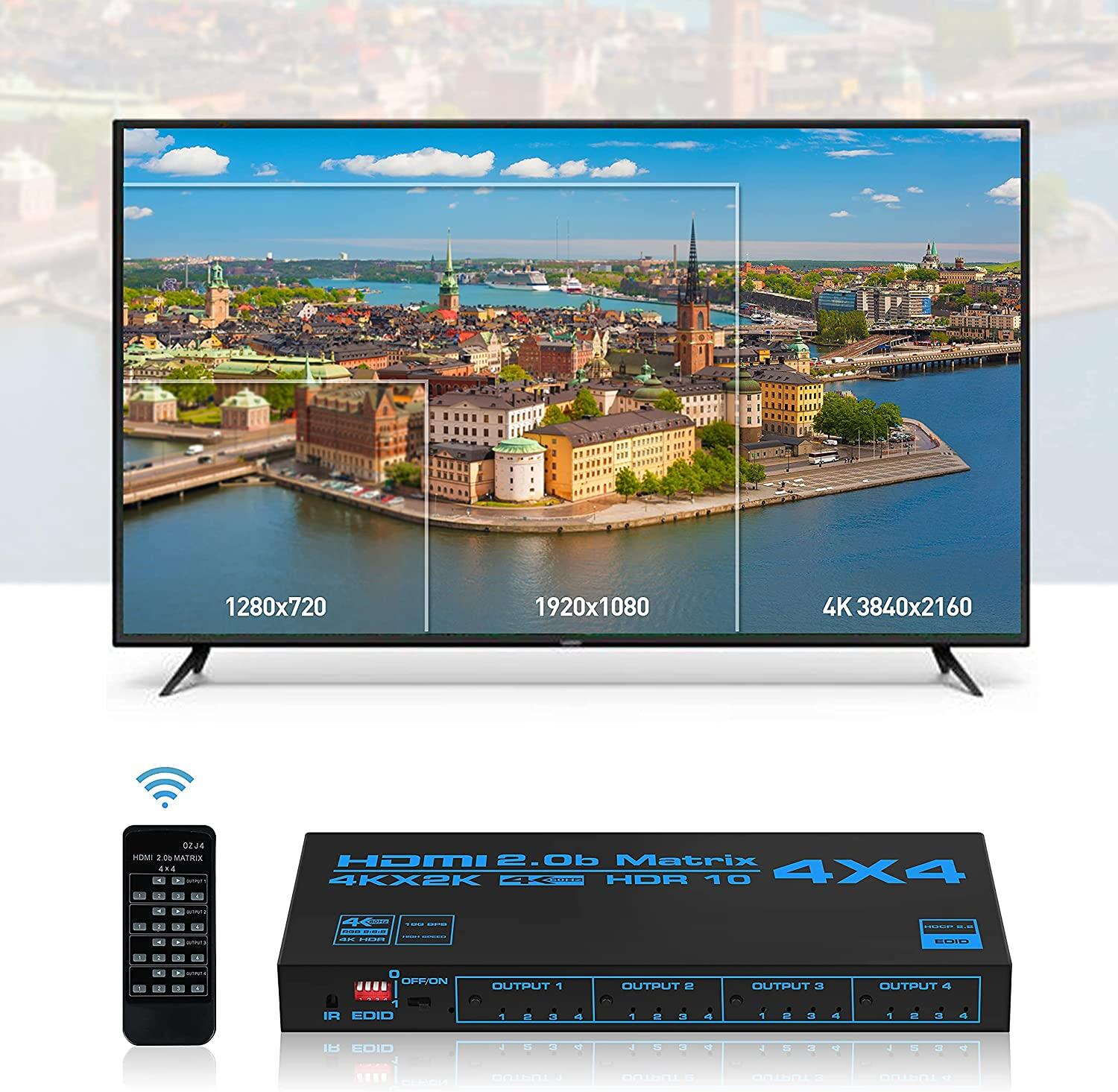 4 HDMI inputs switch and split to 4 HDMI displays