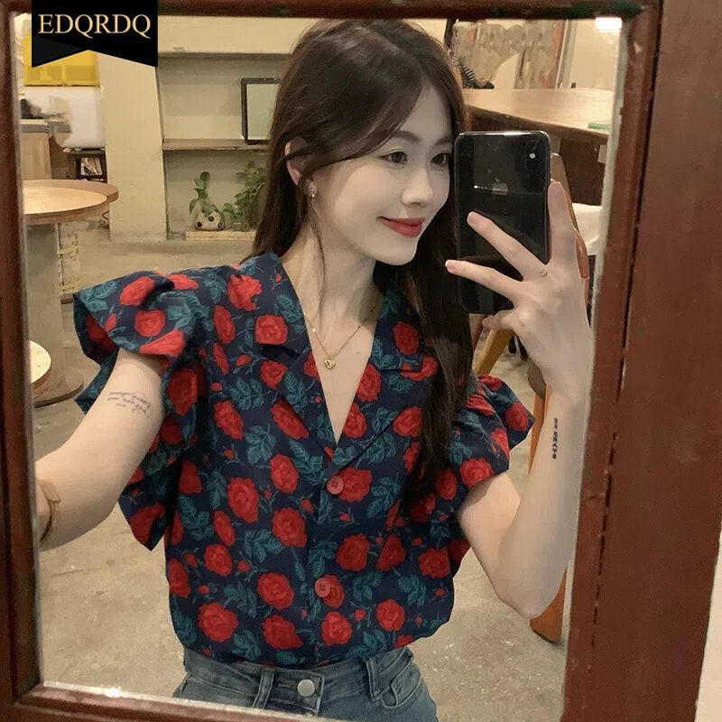 EDQRDQ Floral Tops Ruffles V Neck Petal Sleeve Batwing Blouses for Women