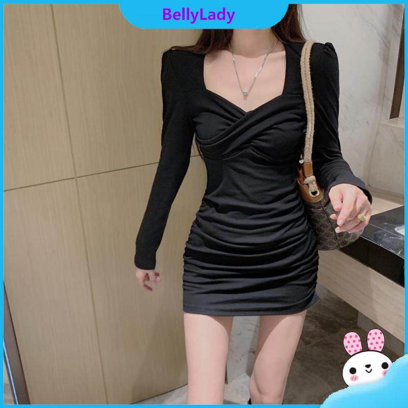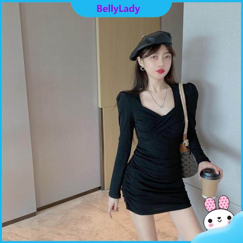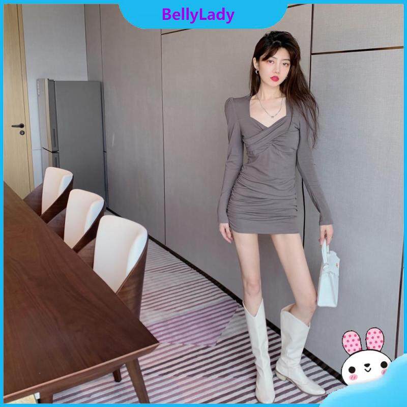 Women Long Sleeves Dress Girls Trendy Solid Color High Waist Bodycon Skirt Elegant Slim Fit Short Skirt