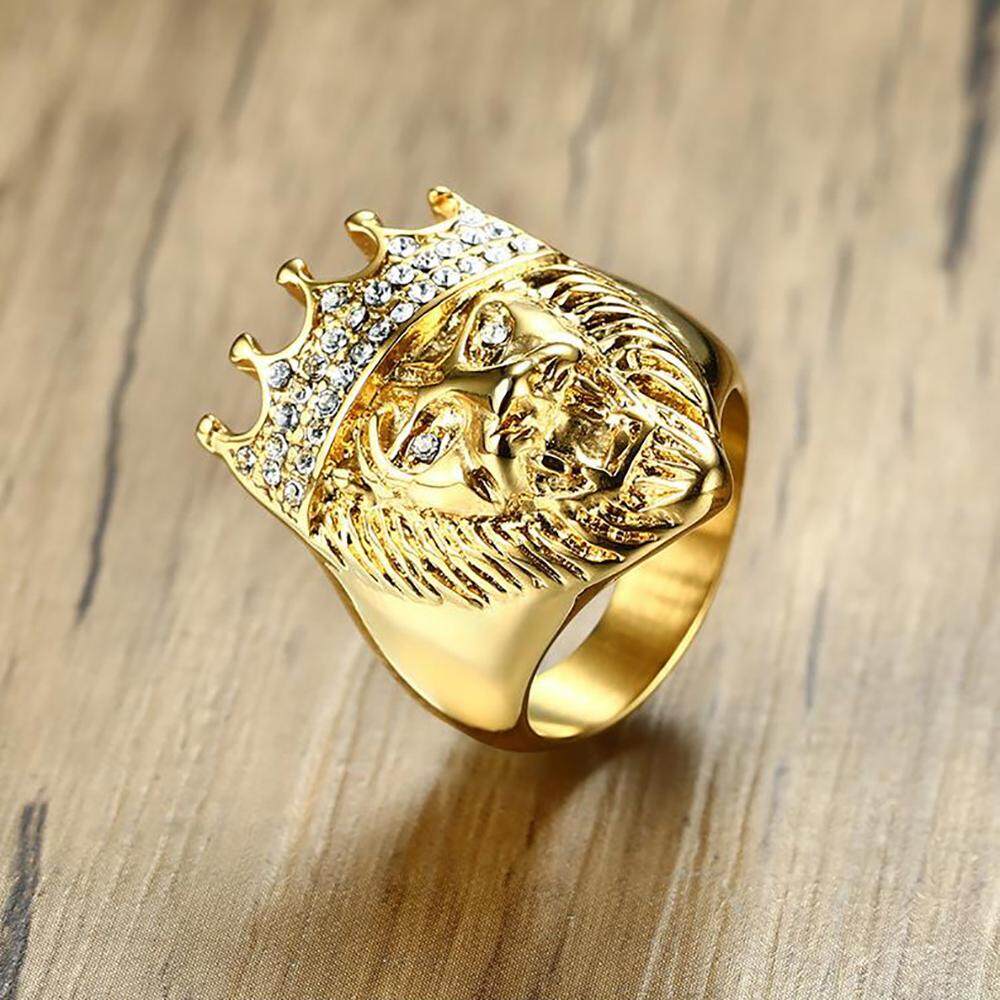 Kemstone Stainless Steel Crystal Gold Plated Crown Lion Ring For Men