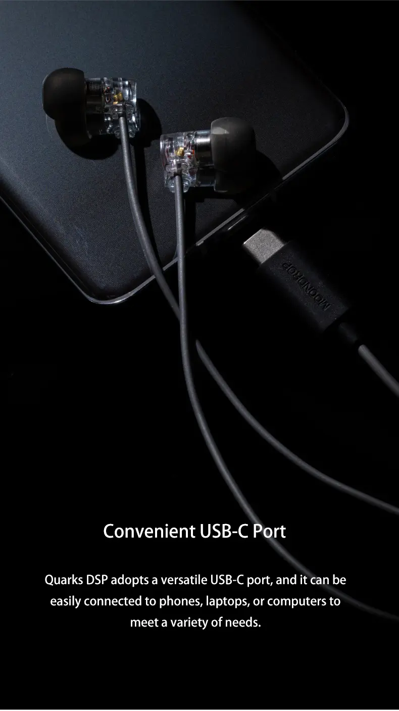 > Moondrop has redesigned the classic Quarks with a Type-C connection port. It supports easy connectivity with most latest smartphones and laptops. It not only gets a modified connection interface but also has upgraded signal input via integrated DSP adjustments.
