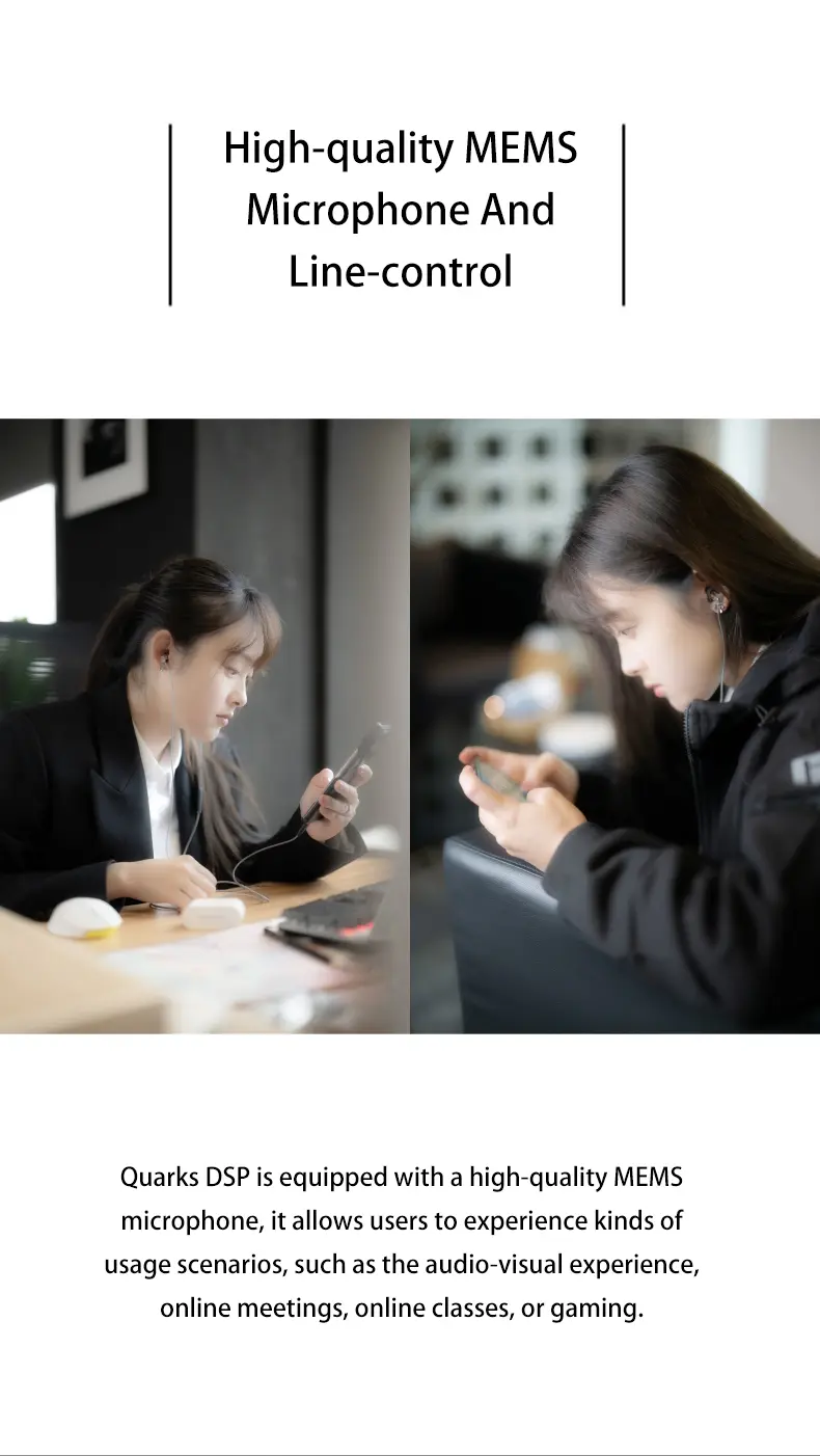 > Quarks DSP is equipped with a high-quality MEMS microphone. It enables crisp voice transmission over calls even in noisy environments.